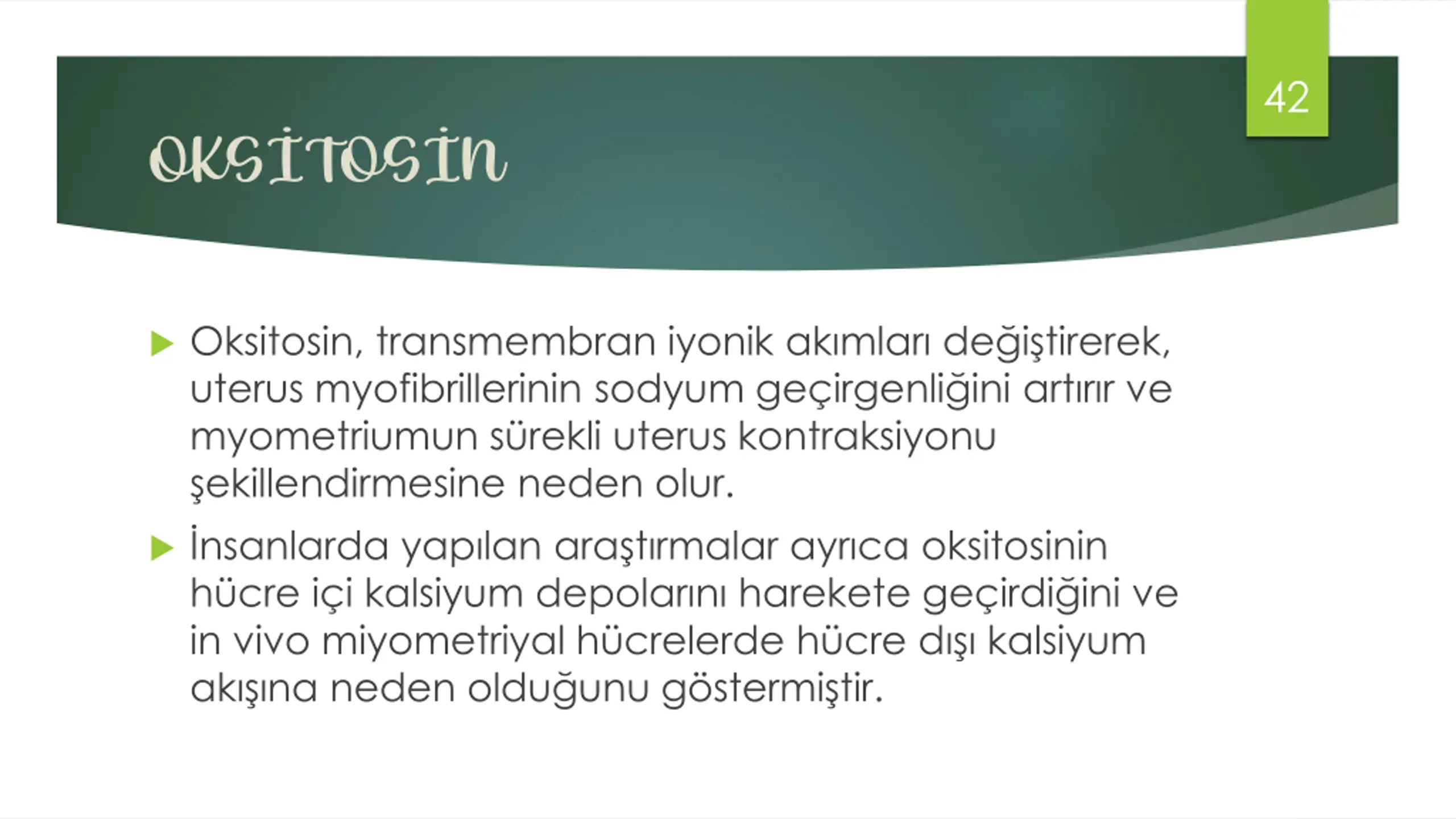 42 OKS TOS N Oksitosin, transmembran iyonik ak mlar de i tirerek, uterus myofibrillerinin sodyum ge irgenli ini art r r ve myometriumun s rekli uterus kontraksiyonu ekillendirmesine neden olur. nsanlarda yap lan ara t rmalar ayr ca oksitosinin h cre i i kalsiyum depolar n harekete ge irdi ini ve in vivo miyometriyal h crelerde h cre d kalsiyum ak na neden oldu unu g stermi tir.