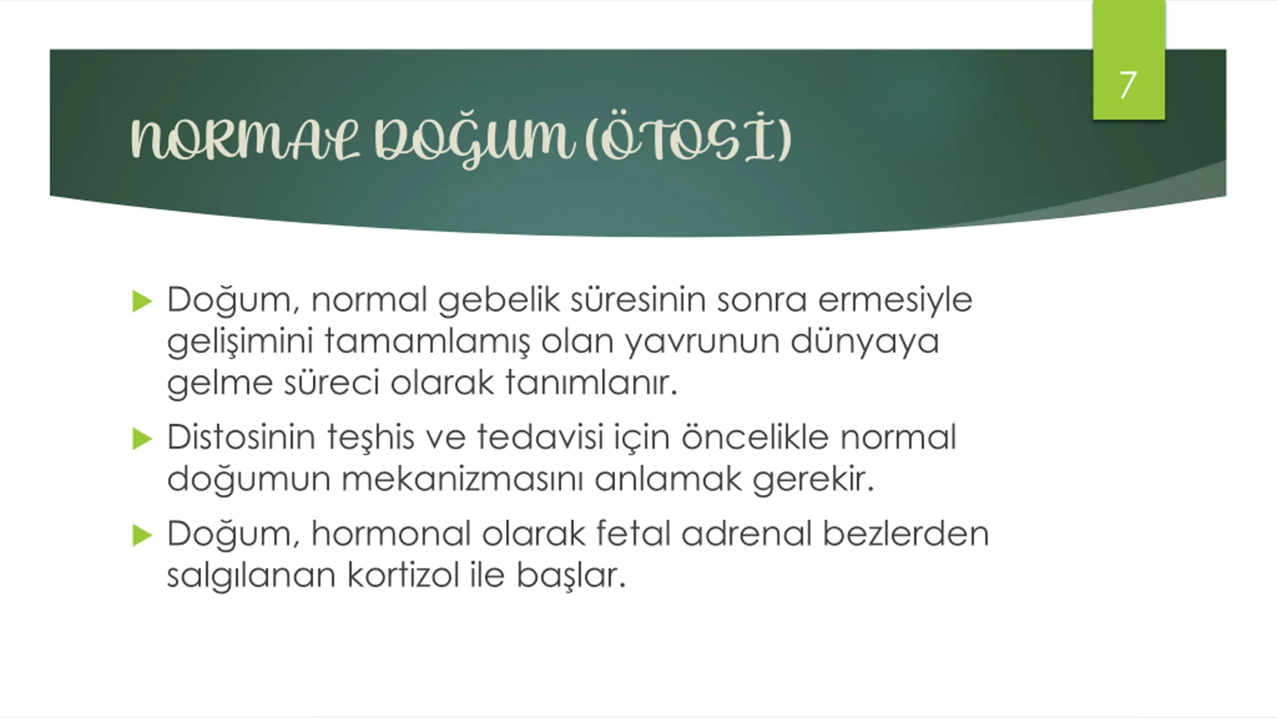 7 NORMAL DO UM ( TOS ) Do um, normal gebelik s resinin sonra ermesiyle geli imini tamamlam olan yavrunun d nyaya gelme s reci olarak tan mlan r. Distosinin te his ve tedavisi i in ncelikle normal do umun mekanizmas n anlamak gerekir. Do um, hormonal olarak fetal adrenal bezlerden salg lanan kortizol ile ba lar.