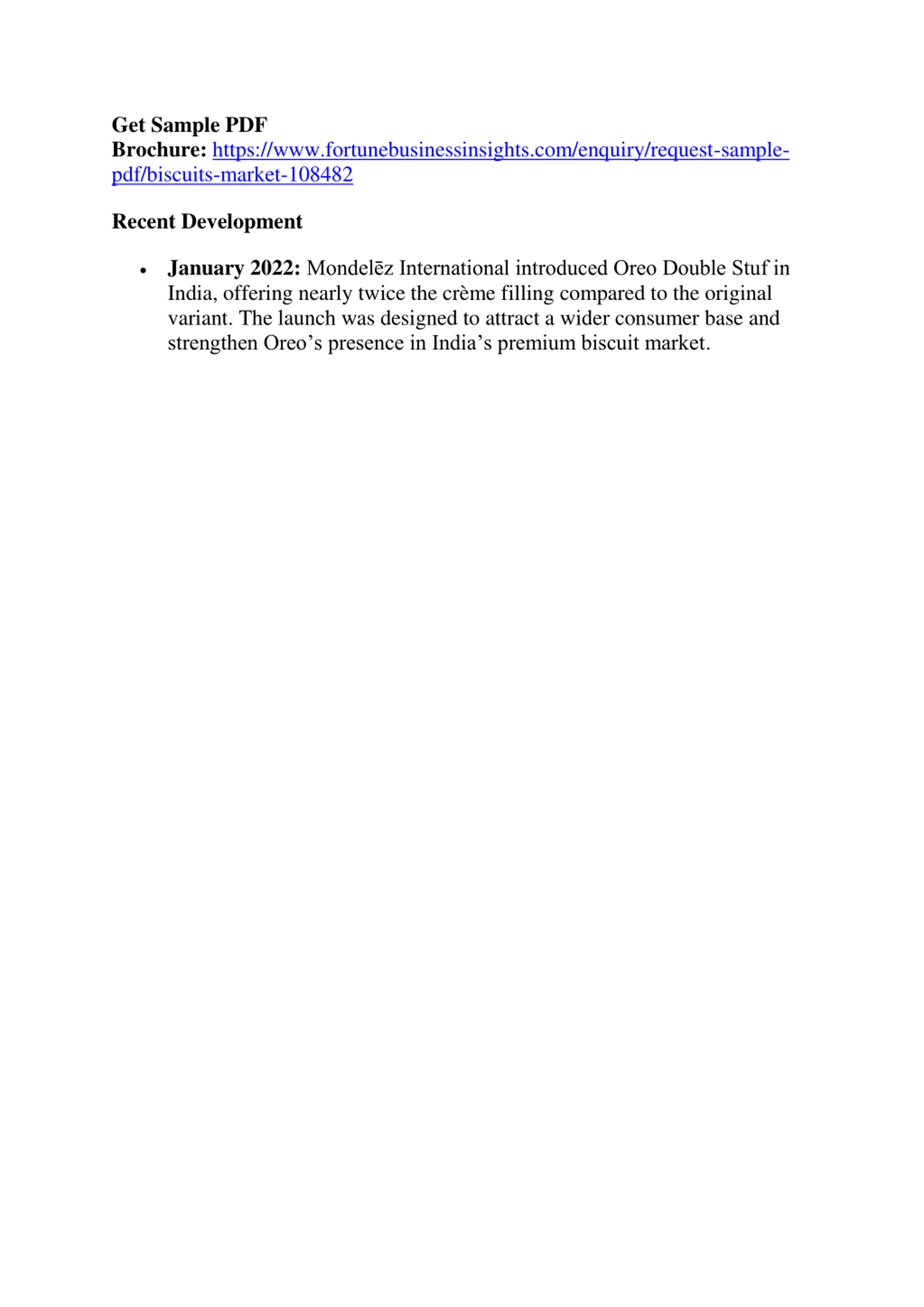 Get Sample PDF Brochure: https://www.fortunebusinessinsights.com/enquiry/request-sample- pdf/biscuits-market-108482 Recent Development January 2022:Mondel z International introduced Oreo Double Stuf in India, offering nearly twice the cr me filling compared to the original variant. The launch was designed to attract a wider consumer base and strengthen Oreo s presence in India s premium biscuit market.
