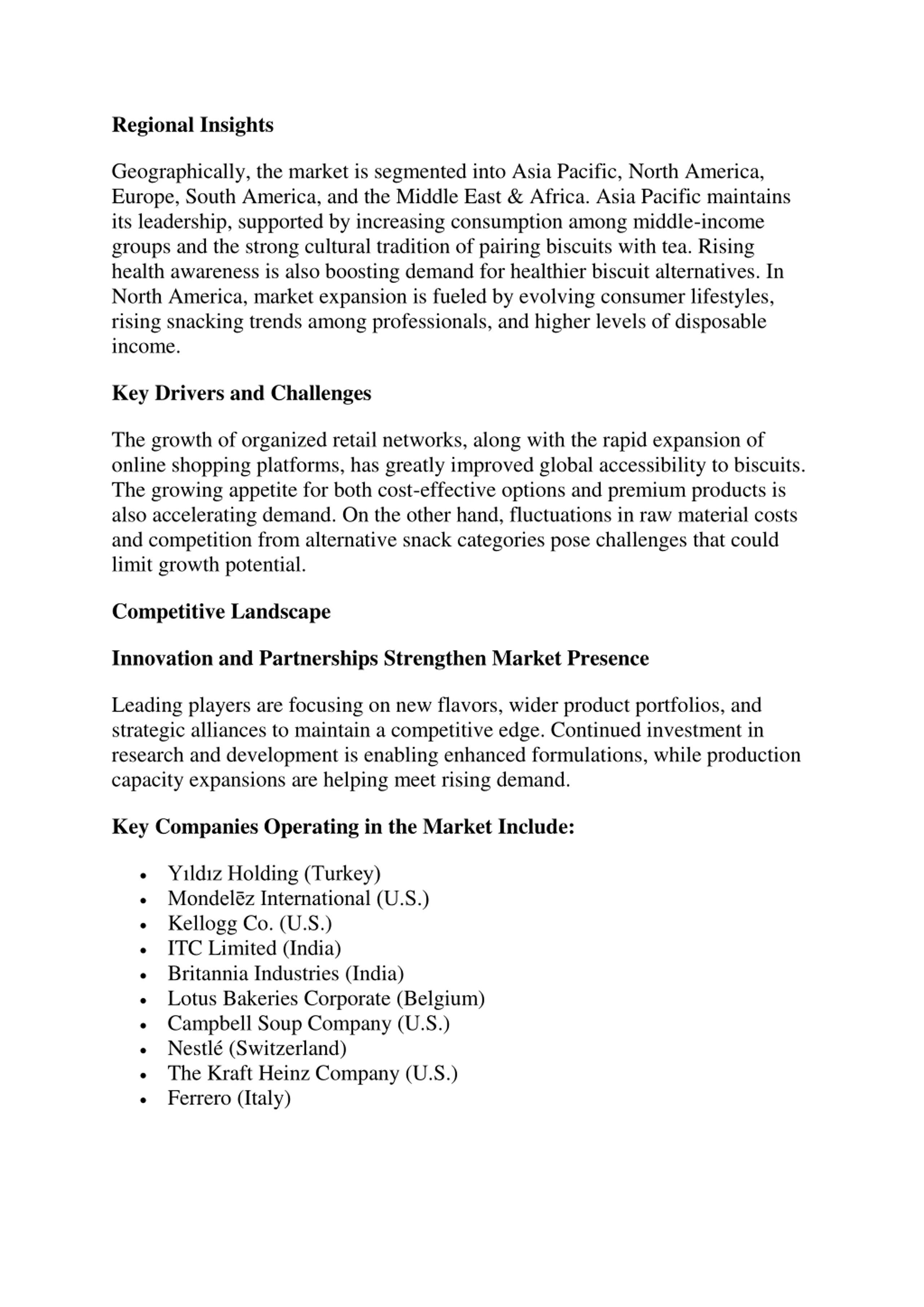 Regional Insights Geographically, the market is segmented into Asia Pacific, North America, Europe, South America, and the Middle East & Africa. Asia Pacific maintains its leadership, supported by increasing consumption among middle-income groups and the strong cultural tradition of pairing biscuits with tea. Rising health awareness is also boosting demand for healthier biscuit alternatives. In North America, market expansion is fueled by evolving consumer lifestyles, rising snacking trends among professionals, and higher levels of disposable income. Key Drivers and Challenges The growth of organized retail networks, along with the rapid expansion of online shopping platforms, has greatly improved global accessibility to biscuits. The growing appetite for both cost-effective options and premium products is also accelerating demand. On the other hand, fluctuations in raw material costs and competition from alternative snack categories pose challenges that could limit growth potential. Competitive Landscape Innovation and Partnerships Strengthen Market Presence Leading players are focusing on new flavors, wider product portfolios, and strategic alliances to maintain a competitive edge. Continued investment in research and development is enabling enhanced formulations, while production capacity expansions are helping meet rising demand. Key Companies Operating in the Market Include: Y ld z Holding (Turkey) Mondel z International (U.S.) Kellogg Co. (U.S.) ITC Limited (India) Britannia Industries (India) Lotus Bakeries Corporate (Belgium) Campbell Soup Company (U.S.) Nestl (Switzerland) The Kraft Heinz Company (U.S.) Ferrero (Italy)