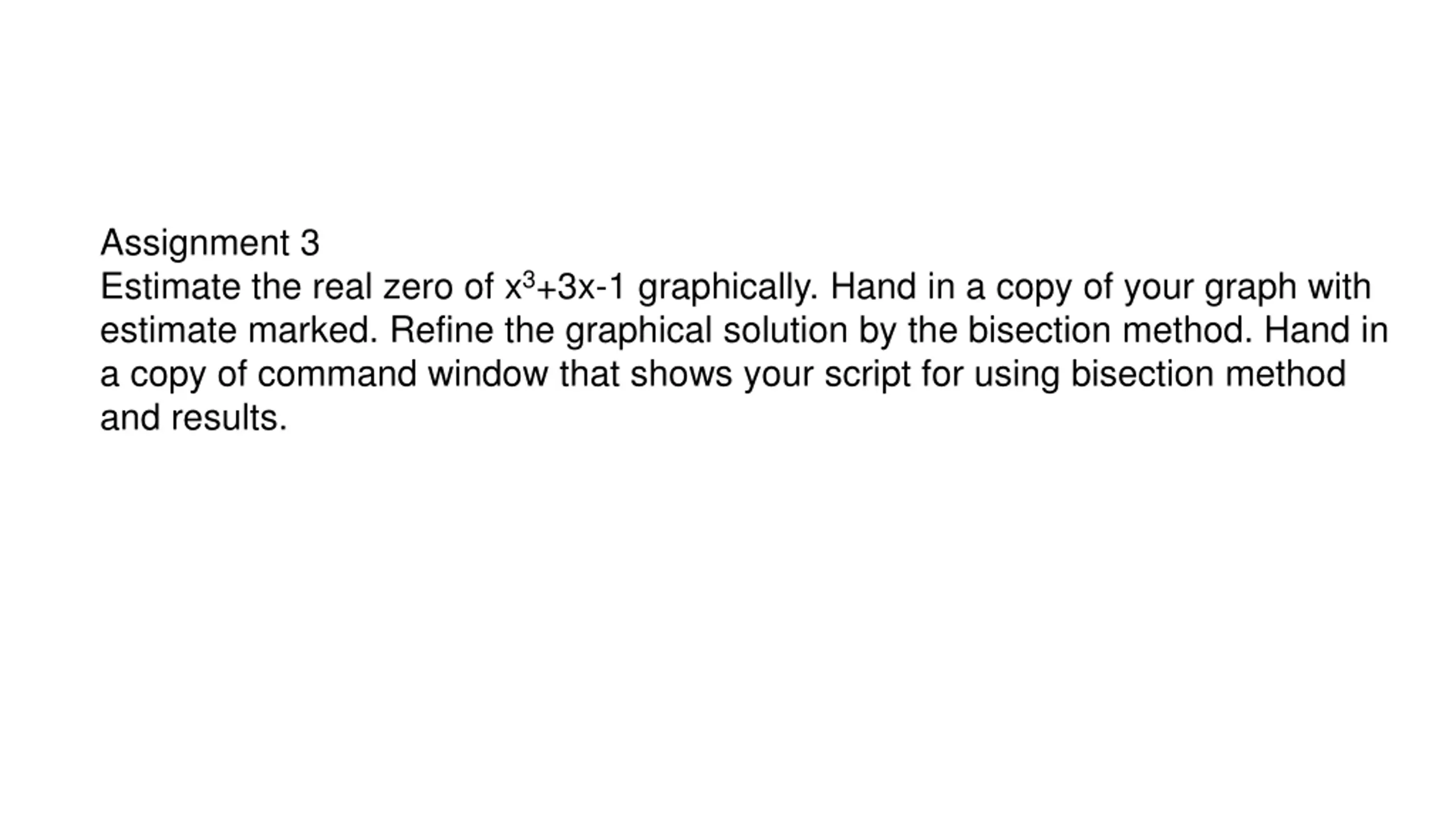 Assignment 3 Estimate the real zero of x3+3x-1 graphically. Hand in a copy of your graph with estimate marked. Refine the graphical solution by the bisection method. Hand in a copy of command window that shows your script for using bisection method and results.