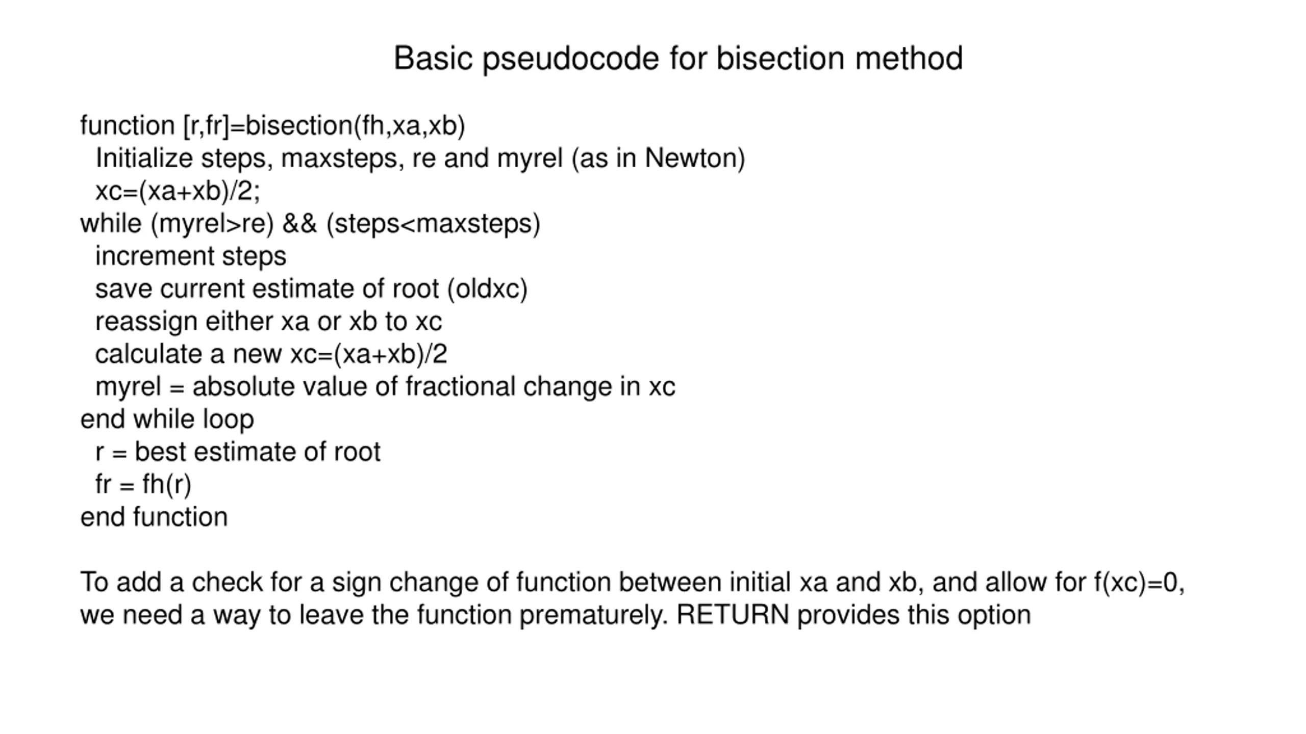 Basic pseudocode for bisection method function [r,fr]=bisection(fh,xa,xb) Initialize steps, maxsteps, re and myrel (as in Newton) xc=(xa+xb)/2; while (myrel>re) && (steps<maxsteps) increment steps save current estimate of root (oldxc) reassign either xa or xb to xc calculate a new xc=(xa+xb)/2 myrel = absolute value of fractional change in xc end while loop r = best estimate of root fr = fh(r) end function To add a check for a sign change of function between initial xa and xb, and allow for f(xc)=0, we need a way to leave the function prematurely. RETURN provides this option