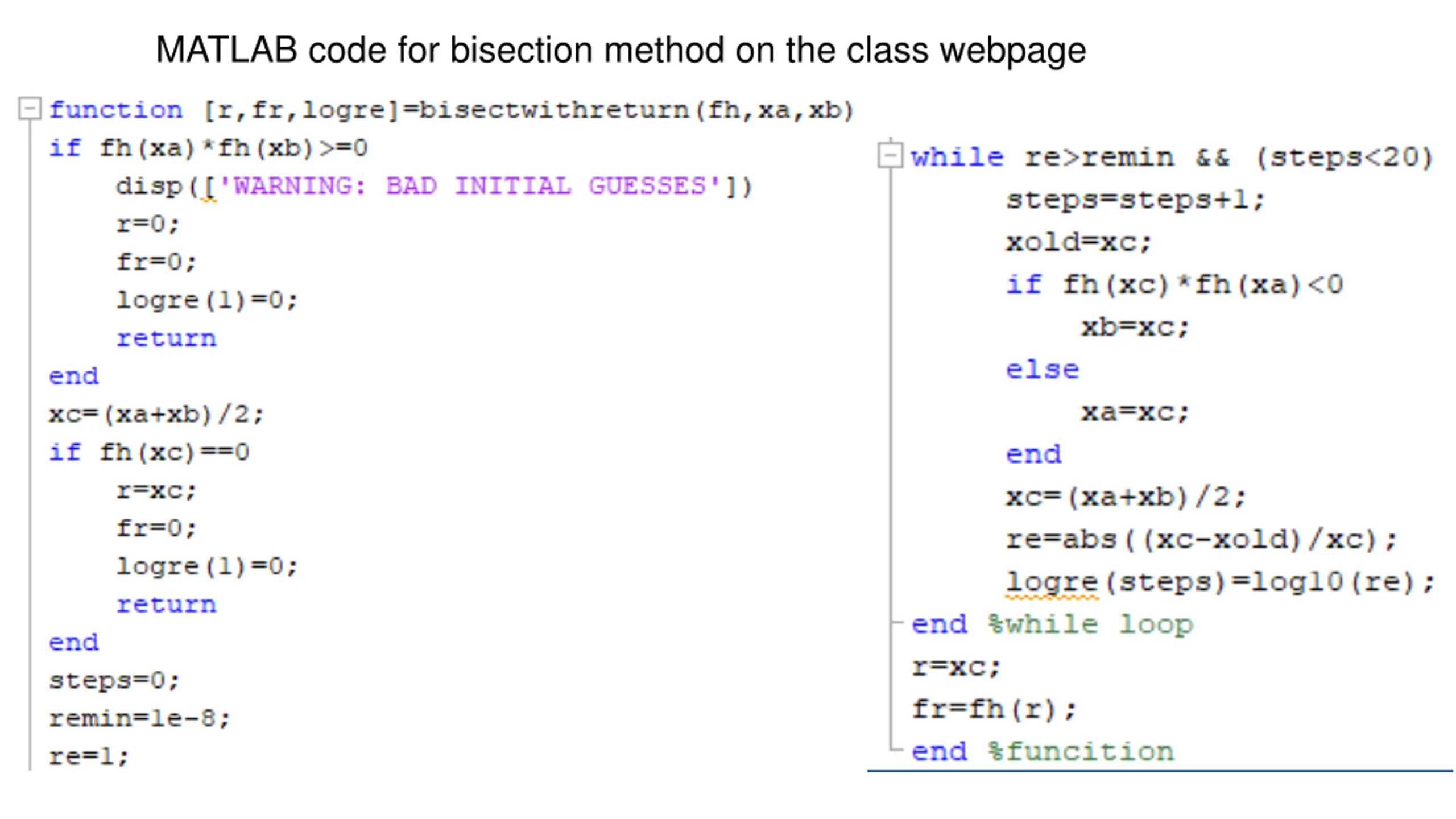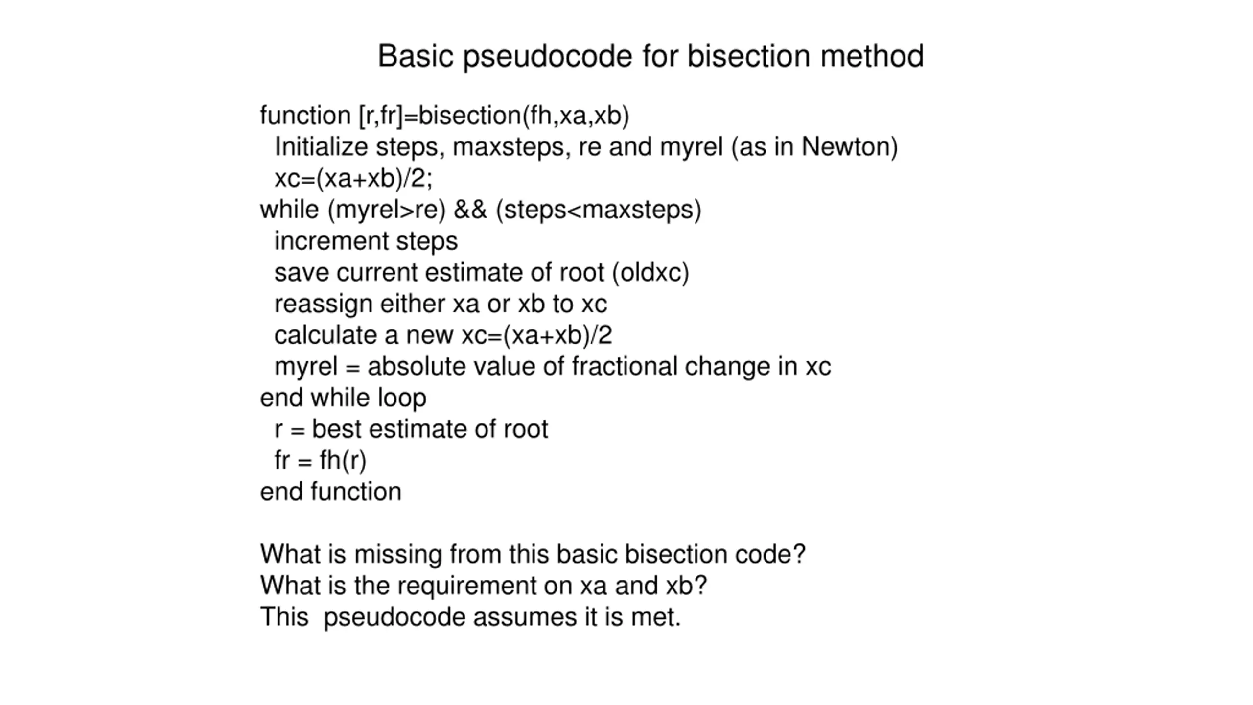 Basic pseudocode for bisection method function [r,fr]=bisection(fh,xa,xb) Initialize steps, maxsteps, re and myrel (as in Newton) xc=(xa+xb)/2; while (myrel>re) && (steps<maxsteps) increment steps save current estimate of root (oldxc) reassign either xa or xb to xc calculate a new xc=(xa+xb)/2 myrel = absolute value of fractional change in xc end while loop r = best estimate of root fr = fh(r) end function What is missing from this basic bisection code? What is the requirement on xa and xb? This pseudocode assumes it is met.