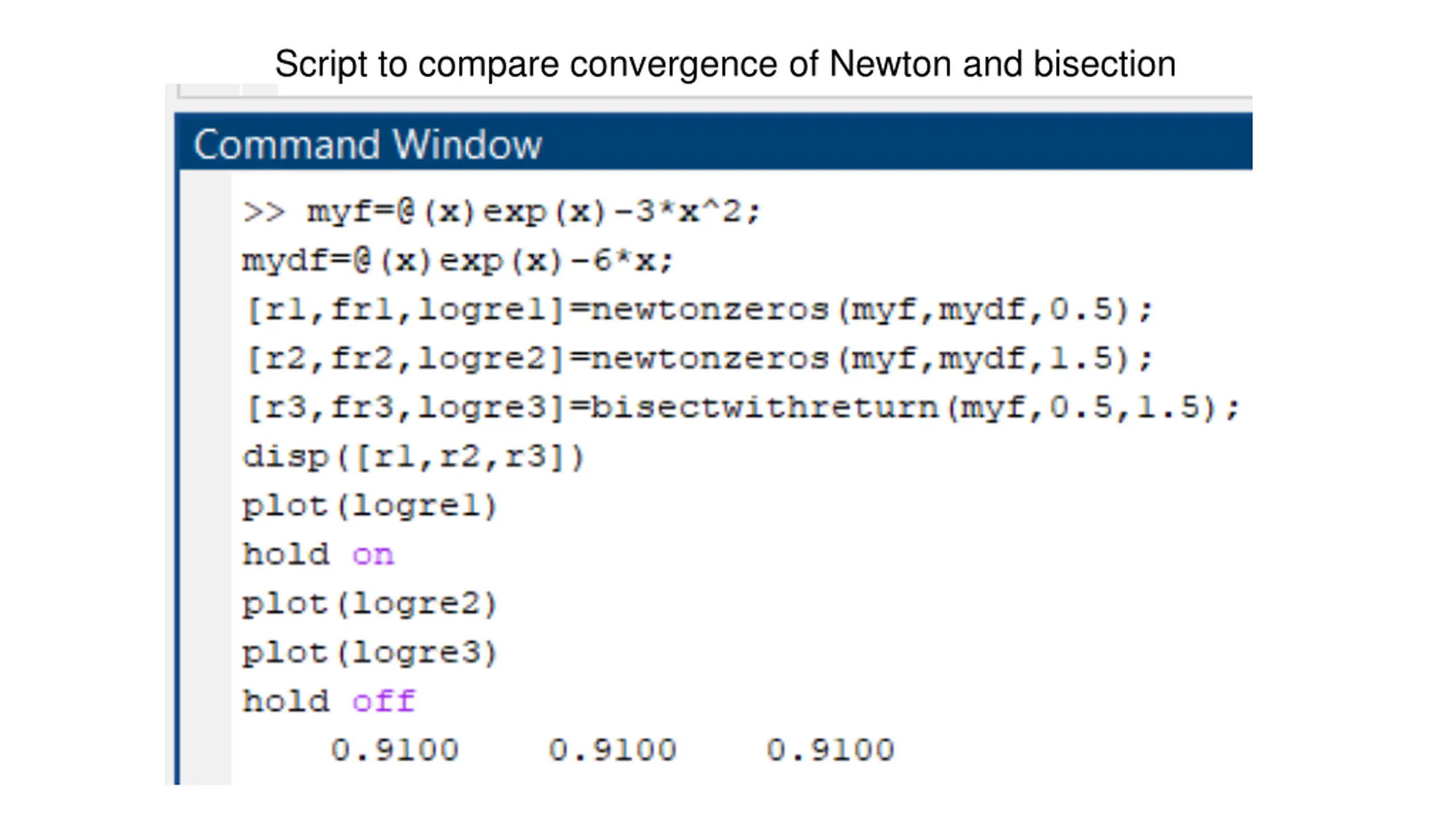 Expand your script that compares rates of convergence of Newtons method to include convergence of the bisection method to the zero of f(x) = ex - 3x2 near 1, when the starting values are 0.5 and 1.5. Display all 3 estimates of the root. Put all 3 convergence curves on the same axes