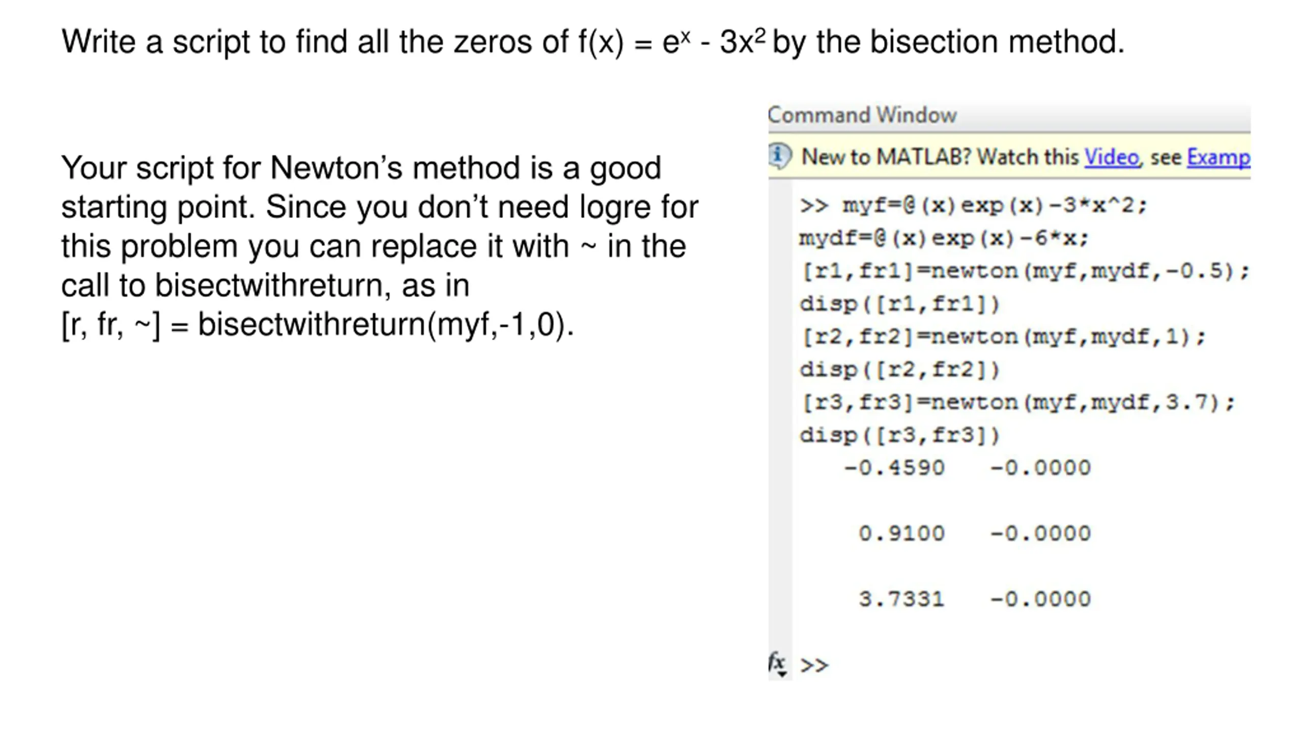 Write a script to find all the zeros of f(x) = ex - 3x2 by the bisection method. Your script for Newton s method is a good starting point. Since you don t need logre for this problem you can replace it with ~ in the call to bisectwithreturn, as in [r, fr, ~] = bisectwithreturn(myf,-1,0).