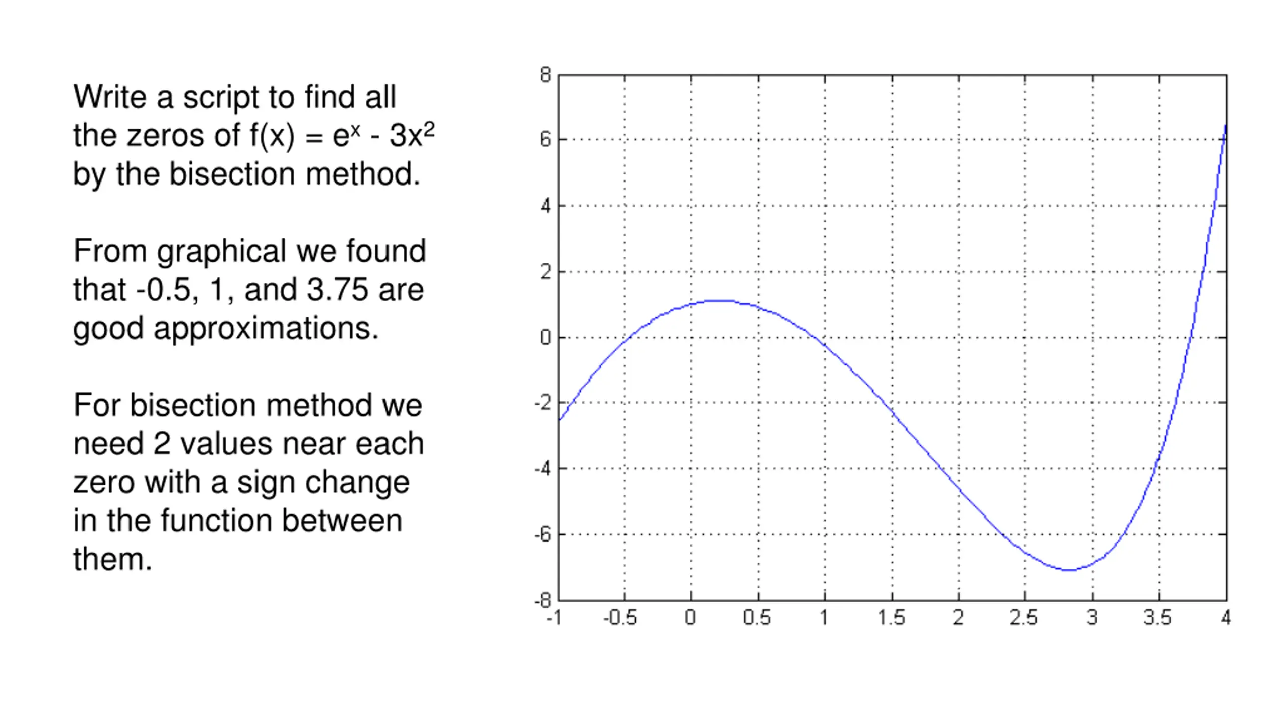 Write a script to find all the zeros of f(x) = ex - 3x2 by the bisection method. From graphical we found that -0.5, 1, and 3.75 are good approximations. For bisection method we need 2 values near each zero with a sign change in the function between them.