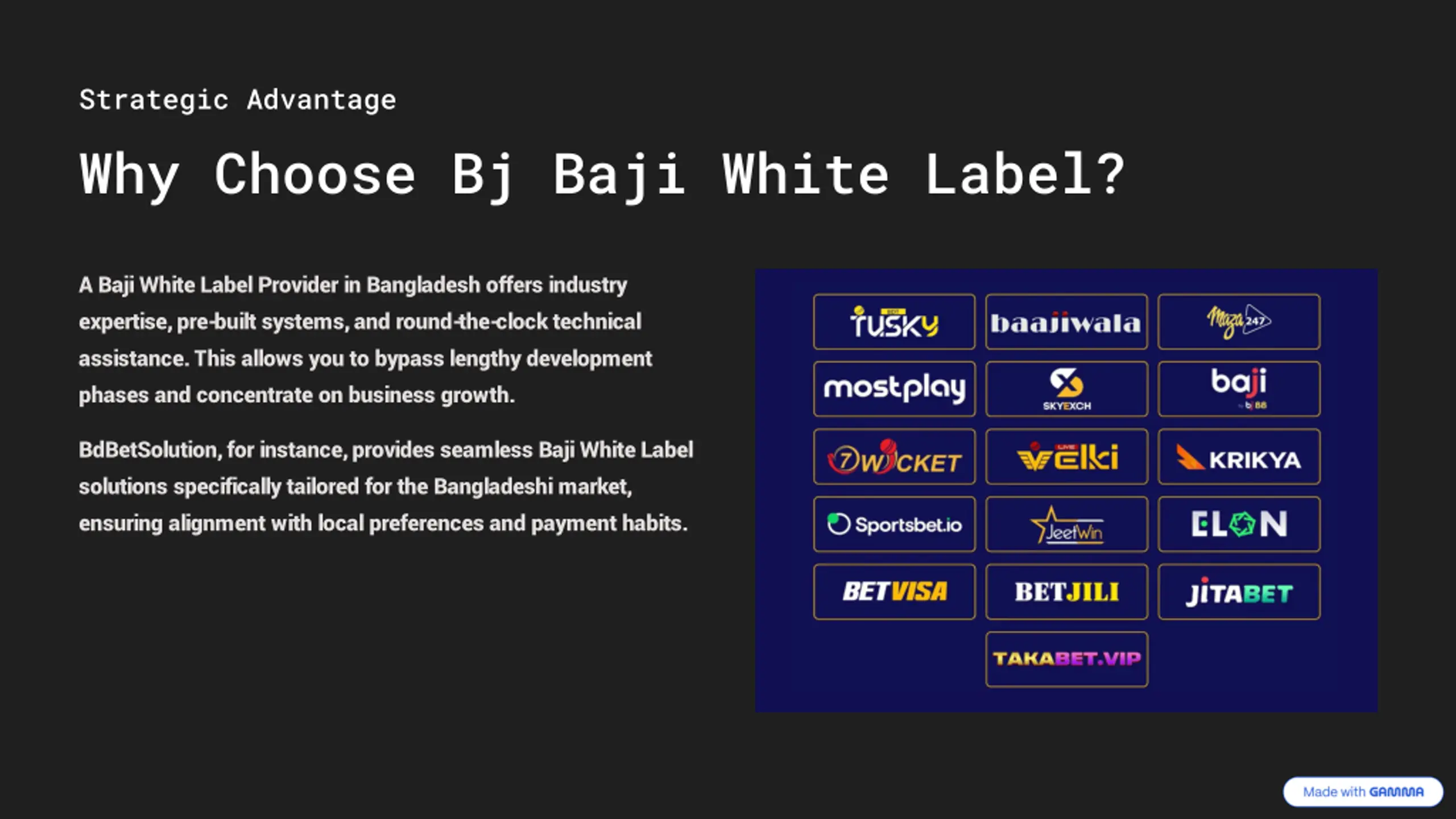 Strategic Advantage Why Choose Bj Baji White Label? A Baji White Label Provider in Bangladesh offers industry expertise, pre-built systems, and round-the-clock technical assistance. This allows you to bypass lengthy development phases and concentrate on business growth. BdBetSolution, for instance, provides seamless Baji White Label solutions specifically tailored for the Bangladeshi market, ensuring alignment with local preferences and payment habits. preencoded.png