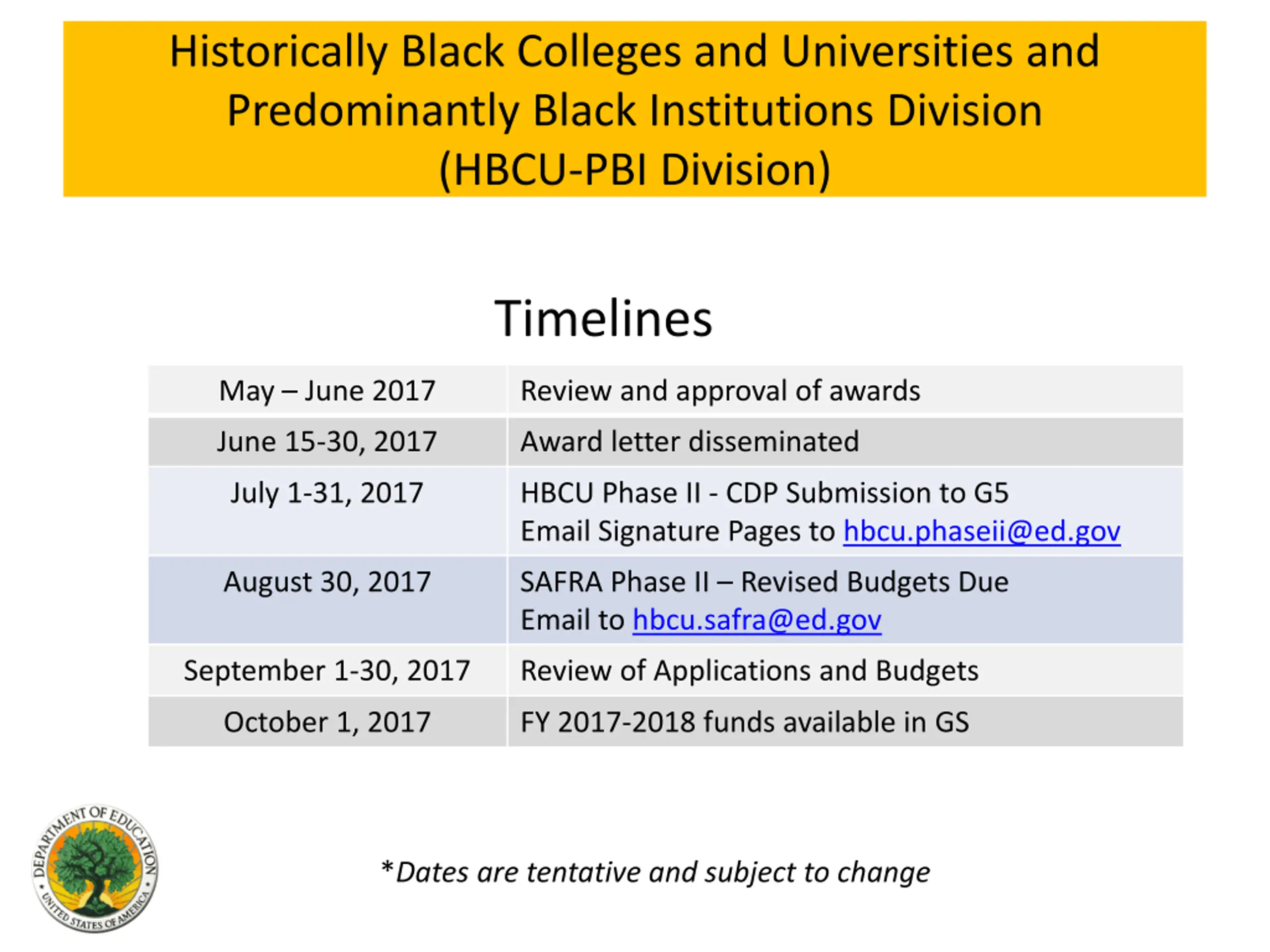 Historically Black Colleges and Universities and Predominantly Black Institutions Division (HBCU-PBI Division) Timelines May June 2017 Review and approval of awards June 15-30, 2017 Award letter disseminated July 1-31, 2017 HBCU Phase II - CDP Submission to G5 Email Signature Pages to hbcu.phaseii@ed.gov August 30, 2017 SAFRA Phase II Revised Budgets Due Email to hbcu.safra@ed.gov September 1-30, 2017 Review of Applications and Budgets October 1, 2017 FY 2017-2018 funds available in GS *Dates are tentative and subject to change