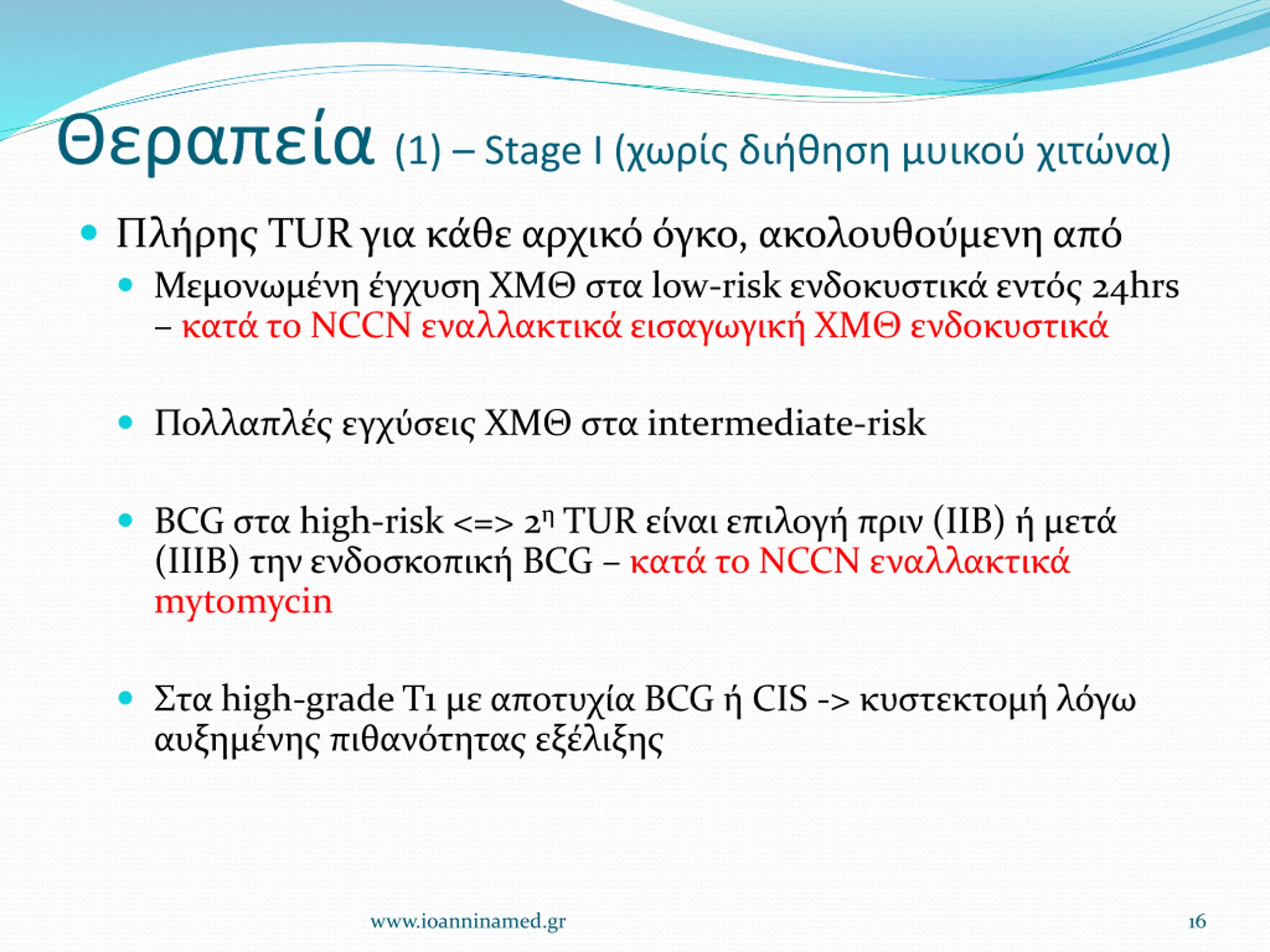 (1) Stage I ( ) TUR , low-risk 24hrs NCCN intermediate-risk BCG high-risk <=> 2 TUR (IIB) (IIIB) BCG NCCN mytomycin high-grade 1 BCG CIS -> www.ioanninamed.gr 16
