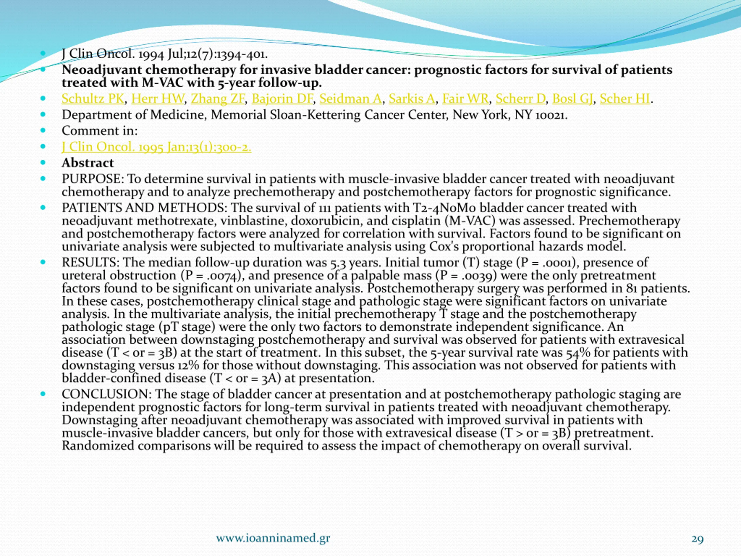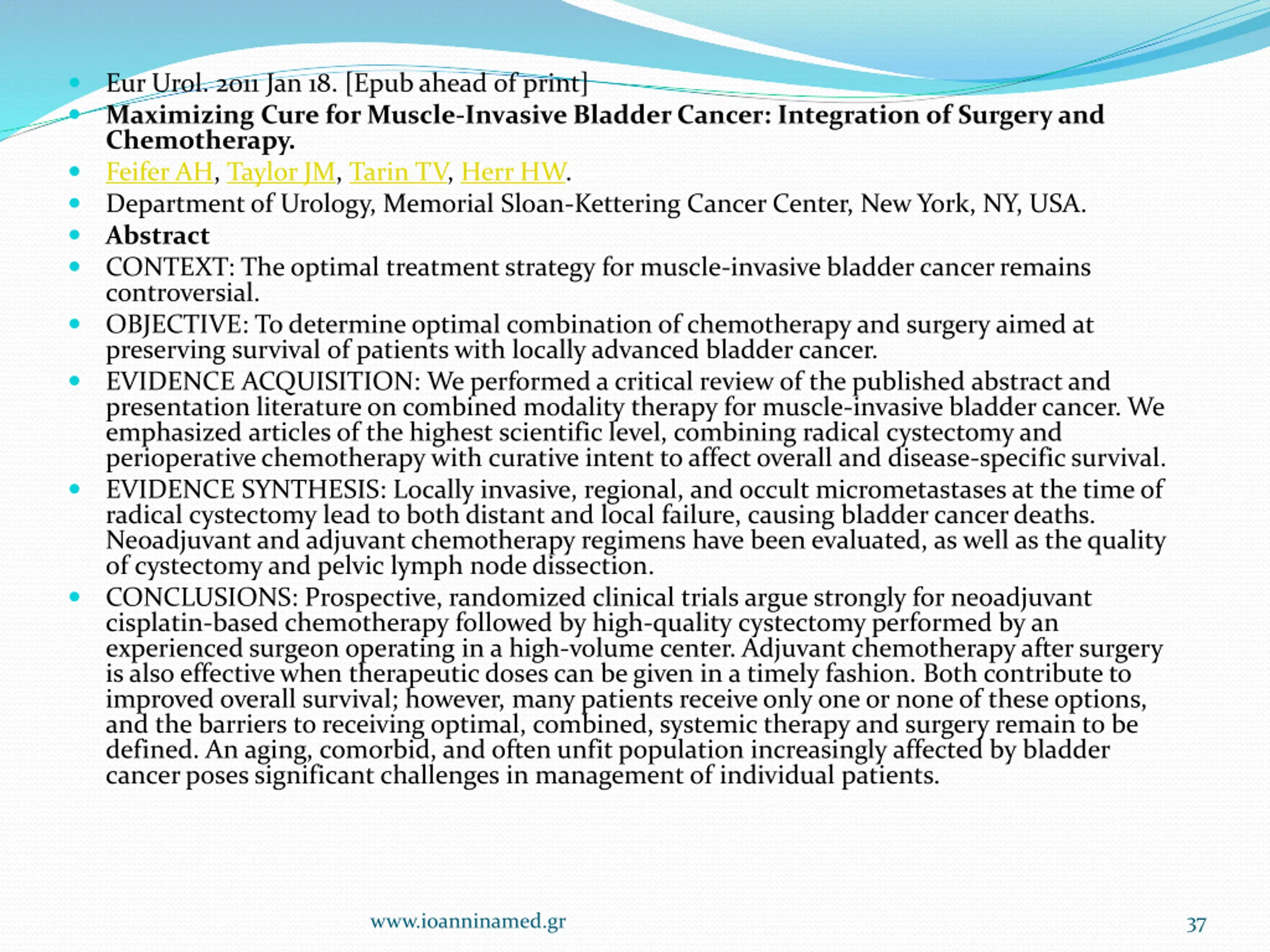 Eur Urol. 2011 Jan 18. [Epubahead of print] Maximizing Cure for Muscle-Invasive Bladder Cancer: Integration of Surgery and Chemotherapy. FeiferAH, Taylor JM, Tarin TV, Herr HW. Department of Urology, Memorial Sloan-Kettering Cancer Center, New York, NY, USA. Abstract CONTEXT: The optimal treatment strategy for muscle-invasive bladder cancer remains controversial. OBJECTIVE: To determine optimal combination of chemotherapy and surgery aimed at preserving survival of patients with locally advanced bladder cancer. EVIDENCE ACQUISITION: We performed a critical review of the published abstract and presentation literature on combined modality therapy for muscle-invasive bladder cancer. We emphasized articles of the highest scientific level, combining radical cystectomyand perioperativechemotherapy with curative intent to affect overall and disease-specific survival. EVIDENCE SYNTHESIS: Locally invasive, regional, and occult micrometastases at the time of radical cystectomy lead to both distant and local failure, causing bladder cancer deaths. Neoadjuvant and adjuvant chemotherapy regimens have been evaluated, as well as the quality of cystectomy and pelvic lymph node dissection. CONCLUSIONS: Prospective, randomized clinical trials argue strongly for neoadjuvant cisplatin-based chemotherapy followed by high-quality cystectomy performed by an experienced surgeon operating in a high-volume center. Adjuvant chemotherapy after surgery is also effective when therapeutic doses can be given in a timely fashion. Both contribute to improved overall survival; however, many patients receive only one or none of these options, and the barriers to receiving optimal, combined, systemic therapy and surgery remain to be defined. An aging, comorbid, and often unfit population increasingly affected by bladder cancer poses significant challenges in management of individual patients. www.ioanninamed.gr 37