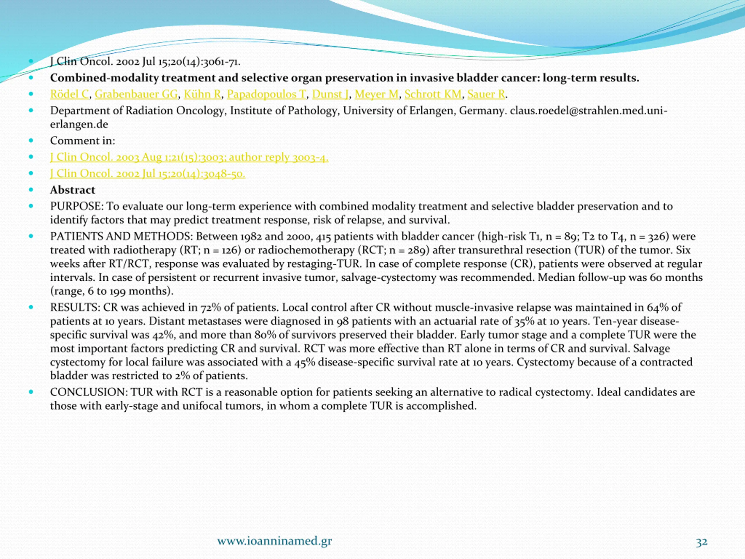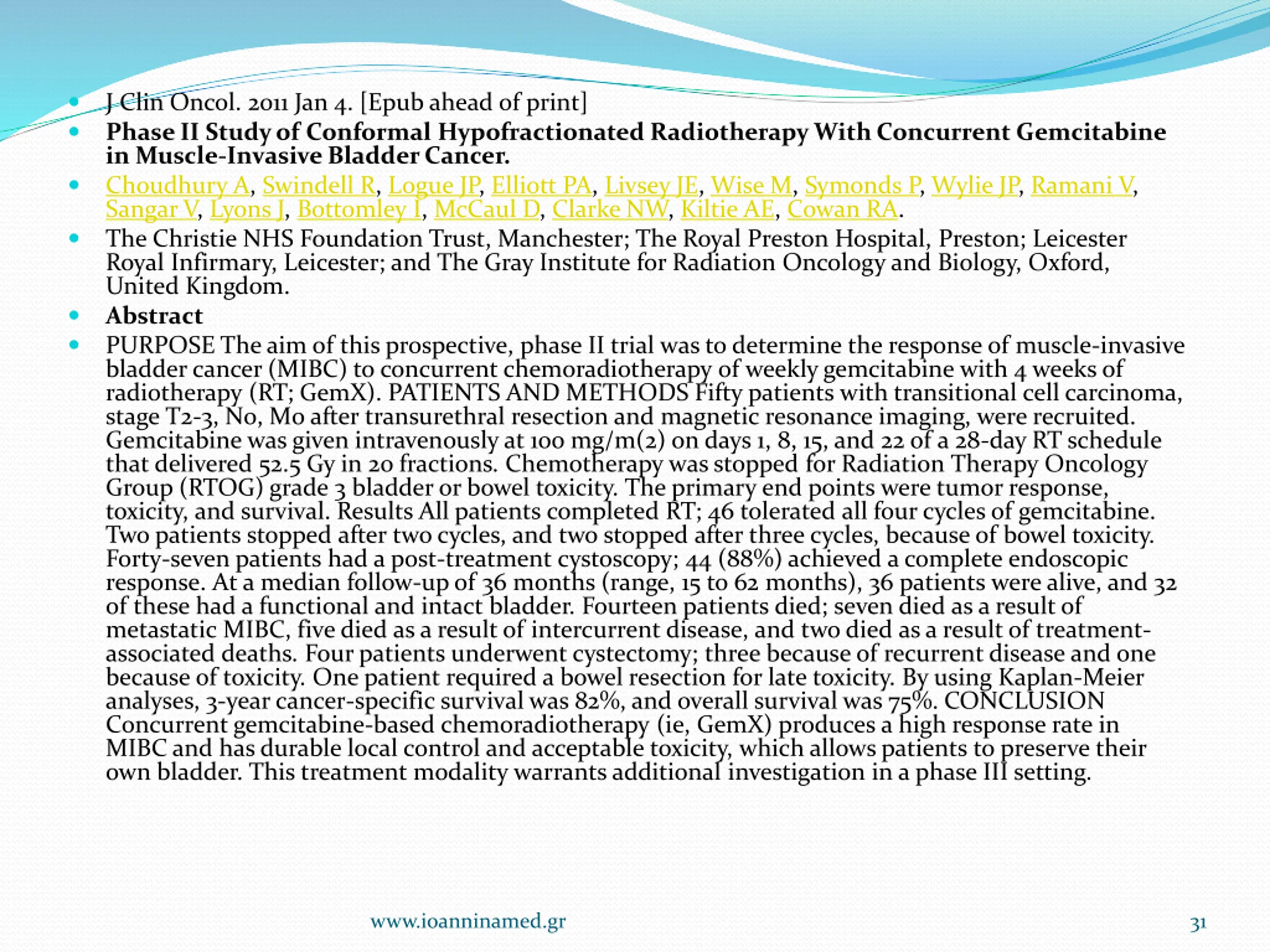 J Clin Oncol. 2011 Jan 4. [Epub ahead of print] Phase II Study of Conformal Hypofractionated Radiotherapy With Concurrent Gemcitabine in Muscle-Invasive Bladder Cancer. Choudhury A, Swindell R, Logue JP, Elliott PA, Livsey JE, Wise M, Symonds P, Wylie JP, Ramani V, SangarV, Lyons J, Bottomley I, McCaul D, Clarke NW, Kiltie AE, Cowan RA. The Christie NHS Foundation Trust, Manchester; The Royal Preston Hospital, Preston; Leicester Royal Infirmary, Leicester; and The Gray Institute for Radiation Oncology and Biology, Oxford, United Kingdom. Abstract PURPOSE The aim of this prospective, phase II trial was to determine the response of muscle-invasive bladder cancer (MIBC) to concurrent chemoradiotherapy of weekly gemcitabine with 4 weeks of radiotherapy (RT; GemX). PATIENTS AND METHODS Fifty patients with transitional cell carcinoma, stage T2-3, N0, M0 after transurethral resection and magnetic resonance imaging, were recruited. Gemcitabine was given intravenously at 100 mg/m(2) on days 1, 8, 15, and 22 of a 28-day RT schedule that delivered 52.5 Gy in 20 fractions. Chemotherapy was stopped for Radiation Therapy Oncology Group (RTOG) grade 3 bladder or bowel toxicity. The primary end points were tumor response, toxicity, and survival. Results All patients completed RT; 46 tolerated all four cycles of gemcitabine. Two patients stopped after two cycles, and two stopped after three cycles, because of bowel toxicity. Forty-seven patients had a post-treatment cystoscopy; 44 (88%) achieved a complete endoscopic response. At a median follow-up of 36 months (range, 15 to 62 months), 36 patients were alive, and 32 of these had a functional and intact bladder. Fourteen patients died; seven died as a result of metastatic MIBC, five died as a result of intercurrent disease, and two died as a result of treatment- associated deaths. Four patients underwent cystectomy; three because of recurrent disease and one because of toxicity. One patient required a bowel resection for late toxicity. By using Kaplan-Meier analyses, 3-year cancer-specific survival was 82%, and overall survival was 75%. CONCLUSION Concurrent gemcitabine-based chemoradiotherapy (ie, GemX) produces a high response rate in MIBC and has durable local control and acceptable toxicity, which allows patients to preserve their own bladder. This treatment modality warrants additional investigation in a phase III setting. www.ioanninamed.gr 31