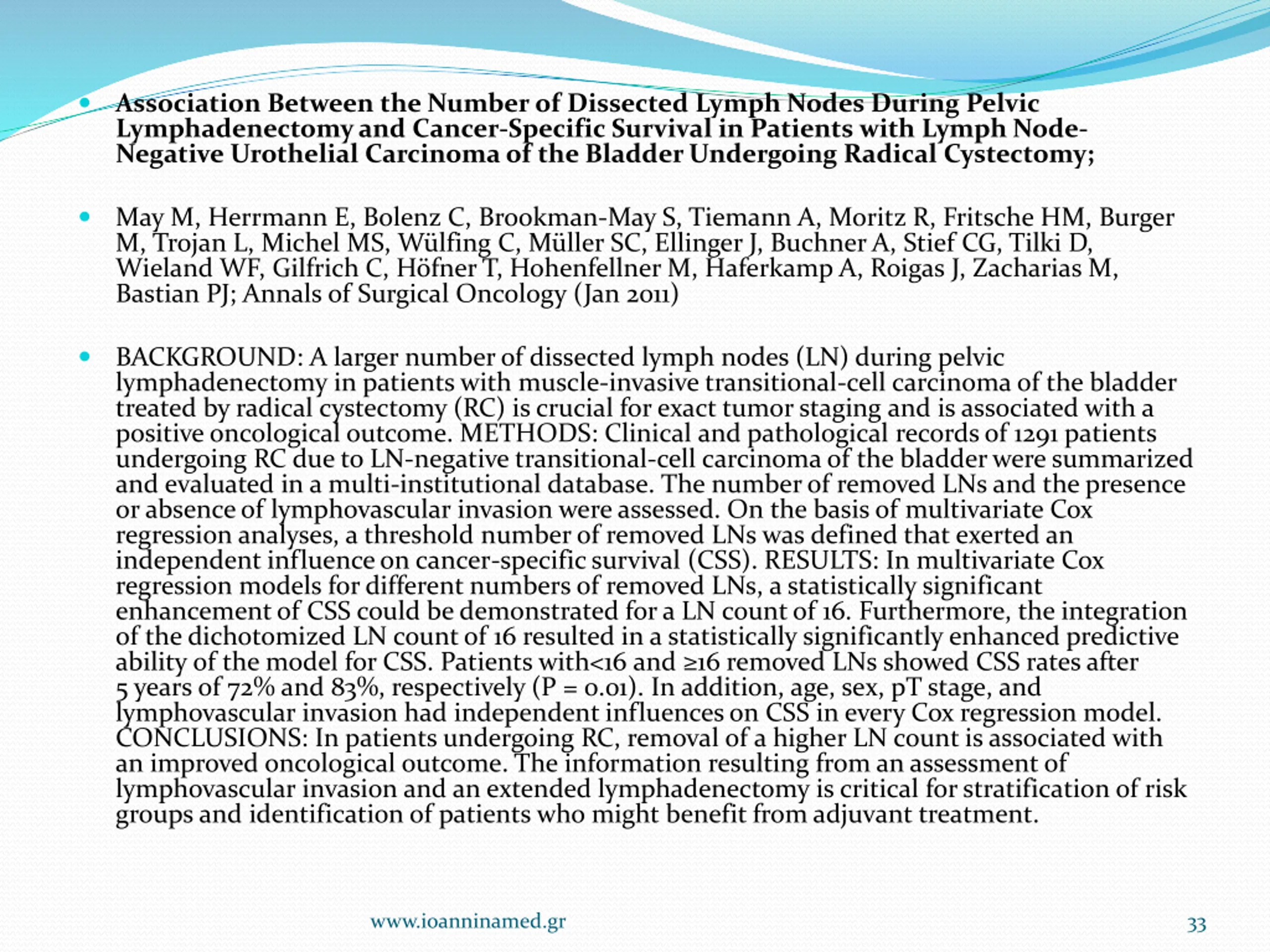 Association Between the Number of Dissected Lymph Nodes During Pelvic Lymphadenectomyand Cancer-Specific Survival in Patients with Lymph Node- Negative Urothelial Carcinoma of the Bladder Undergoing Radical Cystectomy; May M, Herrmann E, Bolenz C, Brookman-May S, Tiemann A, Moritz R, Fritsche HM, Burger M, Trojan L, Michel MS, W lfing C, M ller SC, Ellinger J, Buchner A, Stief CG, Tilki D, Wieland WF, Gilfrich C, H fnerT, Hohenfellner M, Haferkamp A, Roigas J, Zacharias M, Bastian PJ; Annals of Surgical Oncology (Jan 2011) BACKGROUND: A larger number of dissected lymph nodes (LN) during pelvic lymphadenectomy in patients with muscle-invasive transitional-cell carcinoma of the bladder treated by radical cystectomy (RC) is crucial for exact tumor staging and is associated with a positive oncological outcome. METHODS: Clinical and pathological records of 1291 patients undergoing RC due to LN-negative transitional-cell carcinoma of the bladder were summarized and evaluated in a multi-institutional database. The number of removed LNs and the presence or absence of lymphovascular invasion were assessed. On the basis of multivariate Cox regression analyses, a threshold number of removed LNs was defined that exerted an independent influence on cancer-specific survival (CSS). RESULTS: In multivariate Cox regression models for different numbers of removed LNs, a statistically significant enhancement of CSS could be demonstrated for a LN count of 16. Furthermore, the integration of the dichotomized LN count of 16 resulted in a statistically significantly enhanced predictive ability of the model for CSS. Patients with<16 and 16 removed LNs showed CSS rates after 5 years of 72% and 83%, respectively (P = 0.01). In addition, age, sex, pT stage, and lymphovascular invasion had independent influences on CSS in every Cox regression model. CONCLUSIONS: In patients undergoing RC, removal of a higher LN count is associated with an improved oncological outcome. The information resulting from an assessment of lymphovascular invasion and an extended lymphadenectomy is critical for stratification of risk groups and identification of patients who might benefit from adjuvant treatment. www.ioanninamed.gr 33