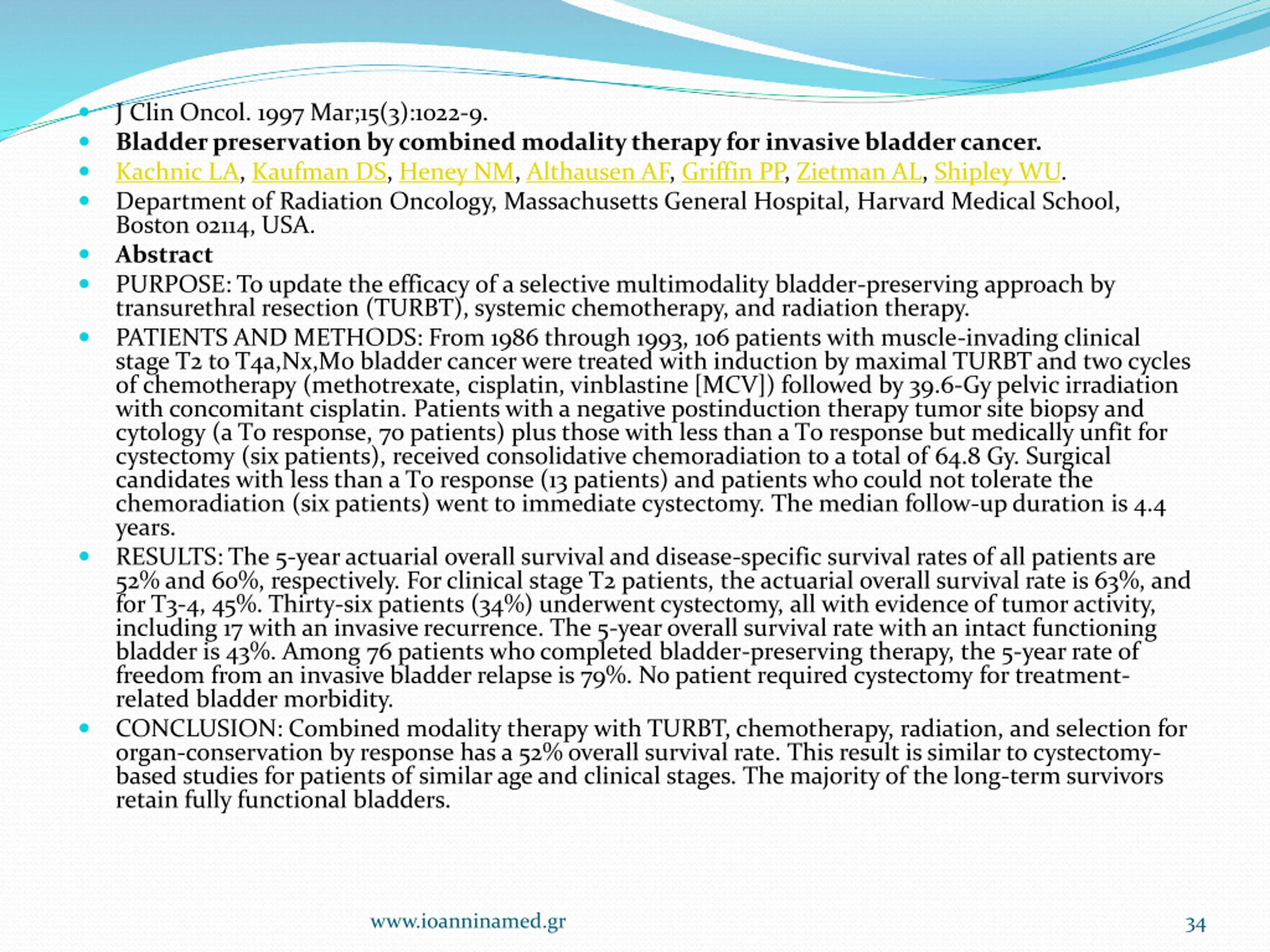 J Clin Oncol. 1997 Mar;15(3):1022-9. Bladder preservation by combined modality therapy for invasive bladder cancer. Kachnic LA, Kaufman DS, Heney NM, Althausen AF, Griffin PP, Zietman AL, Shipley WU. Department of Radiation Oncology, Massachusetts General Hospital, Harvard Medical School, Boston 02114, USA. Abstract PURPOSE: To update the efficacy of a selective multimodality bladder-preserving approach by transurethral resection (TURBT), systemic chemotherapy, and radiation therapy. PATIENTS AND METHODS: From 1986 through 1993, 106 patients with muscle-invading clinical stage T2 to T4a,Nx,M0 bladder cancer were treated with induction by maximal TURBT and two cycles of chemotherapy (methotrexate, cisplatin, vinblastine [MCV]) followed by 39.6-Gy pelvic irradiation with concomitant cisplatin. Patients with a negative postinduction therapy tumor site biopsy and cytology (a T0 response, 70 patients) plus those with less than a T0 response but medically unfit for cystectomy (six patients), received consolidative chemoradiation to a total of 64.8 Gy. Surgical candidates with less than a T0 response (13 patients) and patients who could not tolerate the chemoradiation (six patients) went to immediate cystectomy. The median follow-up duration is 4.4 years. RESULTS: The 5-year actuarial overall survival and disease-specific survival rates of all patients are 52% and 60%, respectively. For clinical stage T2 patients, the actuarial overall survival rate is 63%, and for T3-4, 45%. Thirty-six patients (34%) underwent cystectomy, all with evidence of tumor activity, including 17 with an invasive recurrence. The 5-year overall survival rate with an intact functioning bladder is 43%. Among 76 patients who completed bladder-preserving therapy, the 5-year rate of freedom from an invasive bladder relapse is 79%. No patient required cystectomy for treatment- related bladder morbidity. CONCLUSION: Combined modality therapy with TURBT, chemotherapy, radiation, and selection for organ-conservation by response has a 52% overall survival rate. This result is similar to cystectomy- based studies for patients of similar age and clinical stages. The majority of the long-term survivors retain fully functional bladders. www.ioanninamed.gr 34