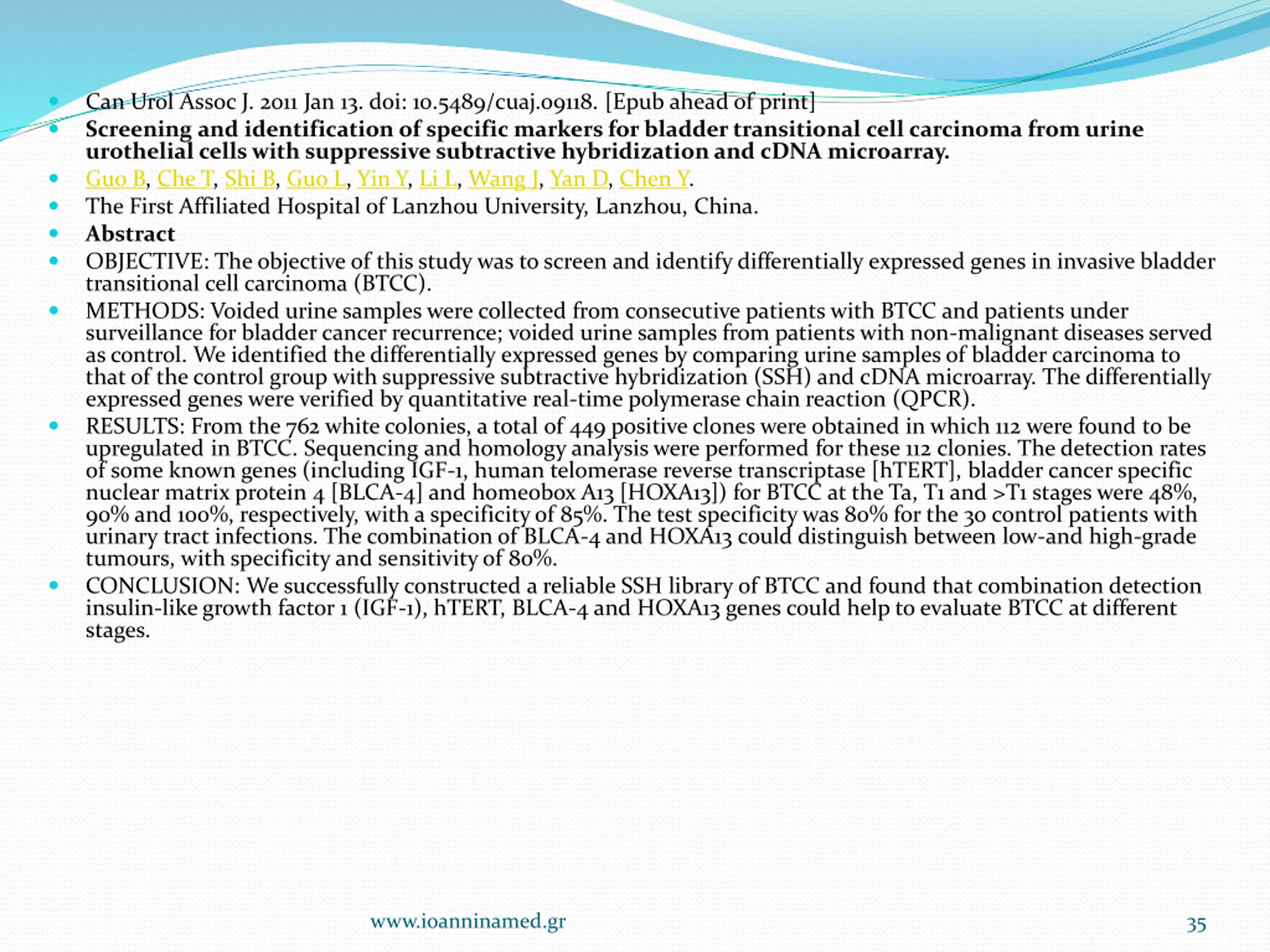 Can Urol Assoc J. 2011 Jan 13. doi: 10.5489/cuaj.09118. [Epub ahead of print] Screening and identification of specific markers for bladder transitional cell carcinoma from urine urothelial cells with suppressive subtractive hybridization and cDNA microarray. Guo B, Che T, Shi B, Guo L, Yin Y, Li L, Wang J, Yan D, Chen Y. The First Affiliated Hospital of Lanzhou University, Lanzhou, China. Abstract OBJECTIVE: The objective of this study was to screen and identify differentially expressed genes in invasive bladder transitional cell carcinoma (BTCC). METHODS: Voided urine samples were collected from consecutive patients with BTCC and patients under surveillance for bladder cancer recurrence; voided urine samples from patients with non-malignant diseases served as control. We identified the differentially expressed genes by comparing urine samples of bladder carcinoma to that of the control group with suppressive subtractive hybridization (SSH) and cDNA microarray. The differentially expressed genes were verified by quantitative real-time polymerase chain reaction (QPCR). RESULTS: From the 762 white colonies, a total of 449 positive clones were obtained in which 112 were found to be upregulated in BTCC. Sequencing and homology analysis were performed for these 112 clonies. The detection rates of some known genes (including IGF-1, human telomerase reverse transcriptase [hTERT], bladder cancer specific nuclear matrix protein 4 [BLCA-4] and homeobox A13 [HOXA13]) for BTCC at the Ta, T1 and >T1 stages were 48%, 90% and 100%, respectively, with a specificity of 85%. The test specificity was 80% for the 30 control patients with urinary tract infections. The combination of BLCA-4 and HOXA13 could distinguish between low-and high-grade tumours, with specificity and sensitivity of 80%. CONCLUSION: We successfully constructed a reliable SSH library of BTCC and found that combination detection insulin-like growth factor 1 (IGF-1), hTERT, BLCA-4 and HOXA13 genes could help to evaluate BTCC at different stages. www.ioanninamed.gr 35