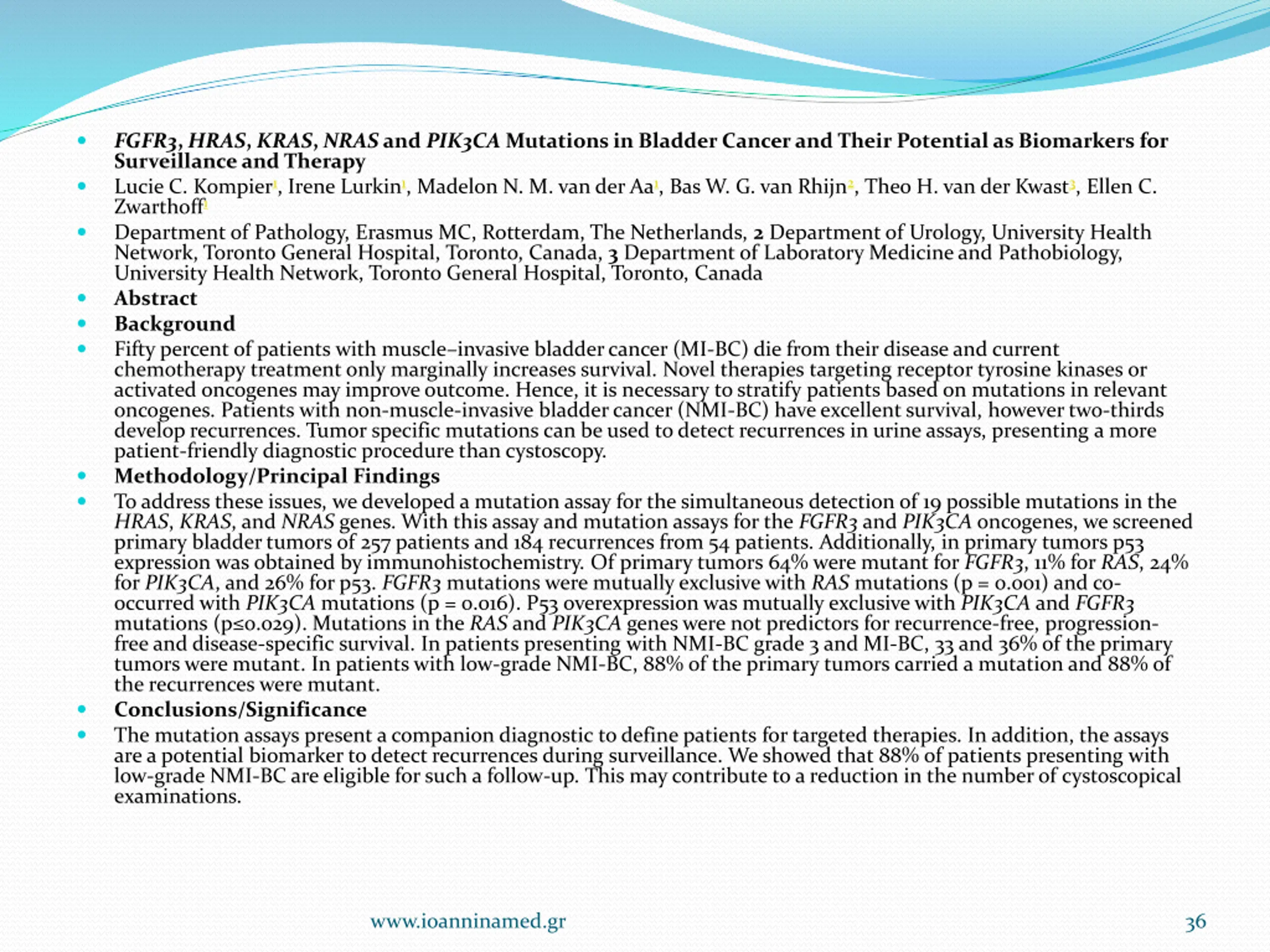 FGFR3, HRAS, KRAS, NRAS and PIK3CA Mutations in Bladder Cancer and Their Potential as Biomarkers for Surveillance and Therapy Lucie C. Kompier1, Irene Lurkin1, Madelon N. M. van derAa1, Bas W. G. van Rhijn2, Theo H. van der Kwast3, Ellen C. Zwarthoff1 Department of Pathology, Erasmus MC, Rotterdam, The Netherlands, 2 Department of Urology, University Health Network, Toronto General Hospital, Toronto, Canada, 3 Department of Laboratory Medicine and Pathobiology, University Health Network, Toronto General Hospital, Toronto, Canada Abstract Background Fifty percent of patients with muscle invasive bladder cancer (MI-BC) die from their disease and current chemotherapy treatment only marginally increases survival. Novel therapies targeting receptor tyrosine kinases or activated oncogenes may improve outcome. Hence, it is necessary to stratify patients based on mutations in relevant oncogenes. Patients with non-muscle-invasive bladder cancer (NMI-BC) have excellent survival, however two-thirds develop recurrences. Tumor specific mutations can be used to detect recurrences in urine assays, presenting a more patient-friendly diagnostic procedure than cystoscopy. Methodology/Principal Findings To address these issues, we developed a mutation assay for the simultaneous detection of 19 possible mutations in the HRAS, KRAS, and NRAS genes. With this assay and mutation assays for the FGFR3 and PIK3CA oncogenes, we screened primary bladder tumors of 257 patients and 184 recurrences from 54 patients. Additionally, in primary tumors p53 expression was obtained by immunohistochemistry. Of primary tumors 64% were mutant for FGFR3, 11% for RAS, 24% for PIK3CA, and 26% for p53. FGFR3 mutations were mutually exclusive with RAS mutations (p = 0.001) and co- occurred with PIK3CA mutations (p = 0.016). P53 overexpression was mutually exclusive with PIK3CA and FGFR3 mutations (p 0.029). Mutations in the RAS and PIK3CA genes were not predictors for recurrence-free, progression- free and disease-specific survival. In patients presenting with NMI-BC grade 3 and MI-BC, 33 and 36% of the primary tumors were mutant. In patients with low-grade NMI-BC, 88% of the primary tumors carried a mutation and 88% of the recurrences were mutant. Conclusions/Significance The mutation assays present a companion diagnostic to define patients for targeted therapies. In addition, the assays are a potential biomarker to detect recurrences during surveillance. We showed that 88% of patients presenting with low-grade NMI-BC are eligible for such a follow-up. This may contribute to a reduction in the number of cystoscopical examinations. www.ioanninamed.gr 36