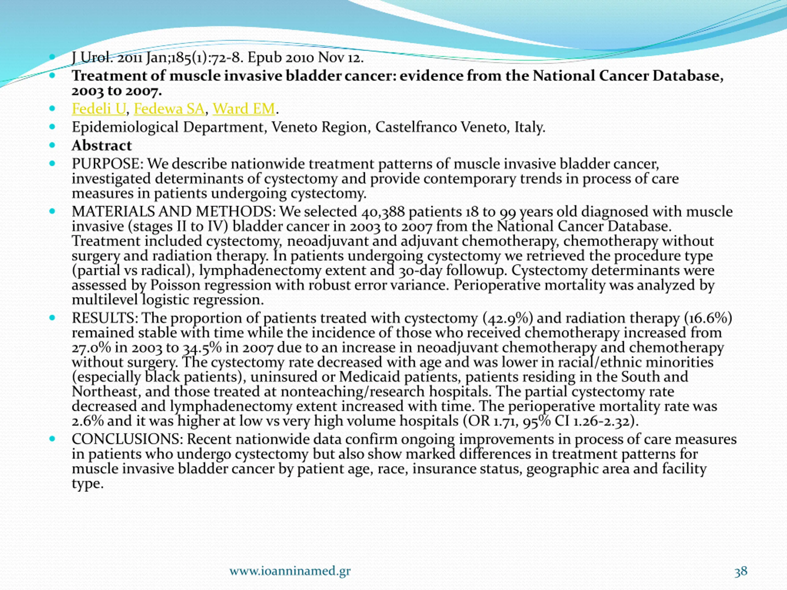 J Urol. 2011 Jan;185(1):72-8. Epub 2010 Nov 12. Treatment of muscle invasive bladder cancer: evidence from the National Cancer Database, 2003 to 2007. Fedeli U, Fedewa SA, Ward EM. Epidemiological Department, Veneto Region, Castelfranco Veneto, Italy. Abstract PURPOSE: We describe nationwide treatment patterns of muscle invasive bladder cancer, investigated determinants of cystectomy and provide contemporary trends in process of care measures in patients undergoing cystectomy. MATERIALS AND METHODS: We selected 40,388 patients 18 to 99 years old diagnosed with muscle invasive (stages II to IV) bladder cancer in 2003 to 2007 from the National Cancer Database. Treatment included cystectomy, neoadjuvant and adjuvant chemotherapy, chemotherapy without surgery and radiation therapy. In patients undergoing cystectomy we retrieved the procedure type (partial vs radical), lymphadenectomy extent and 30-day followup. Cystectomy determinants were assessed by Poisson regression with robust error variance. Perioperative mortality was analyzed by multilevel logistic regression. RESULTS: The proportion of patients treated with cystectomy (42.9%) and radiation therapy (16.6%) remained stable with time while the incidence of those who received chemotherapy increased from 27.0% in 2003 to 34.5% in 2007 due to an increase in neoadjuvant chemotherapy and chemotherapy without surgery. The cystectomy rate decreased with age and was lower in racial/ethnic minorities (especially black patients), uninsured or Medicaid patients, patients residing in the South and Northeast, and those treated at nonteaching/research hospitals. The partial cystectomy rate decreased and lymphadenectomy extent increased with time. The perioperative mortality rate was 2.6% and it was higher at low vsvery high volume hospitals (OR 1.71, 95% CI 1.26-2.32). CONCLUSIONS: Recent nationwide data confirm ongoing improvements in process of care measures in patients who undergo cystectomy but also show marked differences in treatment patterns for muscle invasive bladder cancer by patient age, race, insurance status, geographic area and facility type. www.ioanninamed.gr 38