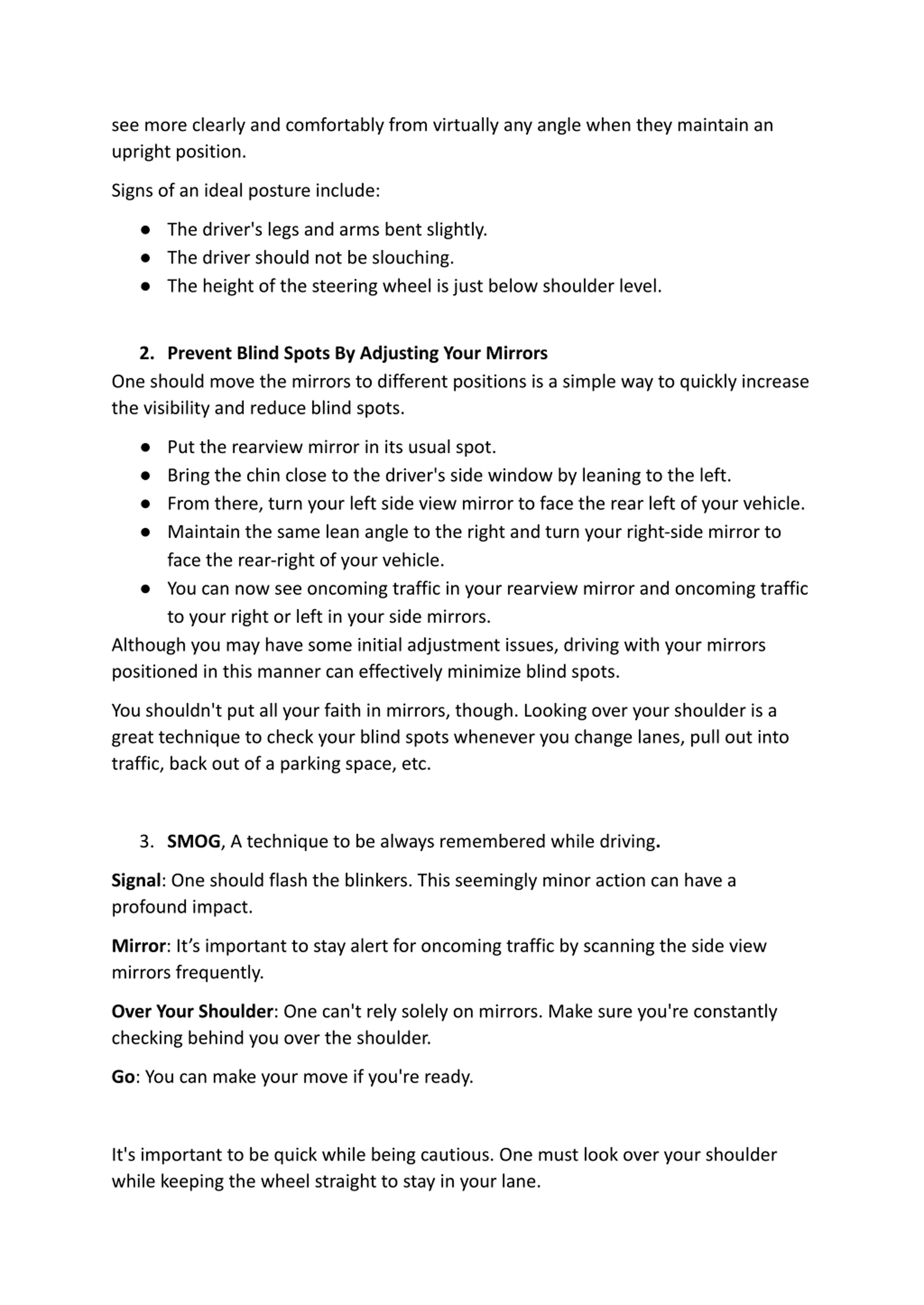 see more clearly and comfortably from virtually any angle when they maintain an upright position. Signs of an ideal posture include: The driver's legs and arms bent slightly. The driver should not be slouching. The height of the steering wheel is just below shoulder level. 2.Prevent Blind Spots By Adjusting Your Mirrors One should move the mirrors to different positions is a simple way to quickly increase the visibility and reduce blind spots. Put the rearview mirror in its usual spot. Bring the chin close to the driver's side window by leaning to the left. From there, turn your left side view mirror to face the rear left of your vehicle. Maintain the same lean angle to the right and turn your right-side mirror to face the rear-right of your vehicle. You can now see oncoming traffic in your rearview mirror and oncoming traffic to your right or left in your side mirrors. Although you may have some initial adjustment issues, driving with your mirrors positioned in this manner can effectively minimize blind spots. You shouldn't put all your faith in mirrors, though. Looking over your shoulder is a great technique to check your blind spots whenever you change lanes, pull out into traffic, back out of a parking space, etc. 3.SMOG, A technique to be always remembered while driving. Signal: One should flash the blinkers. This seemingly minor action can have a profound impact. Mirror: It s important to stay alert for oncoming traffic by scanning the side view mirrors frequently. Over Your Shoulder: One can't rely solely on mirrors. Make sure you're constantly checking behind you over the shoulder. Go: You can make your move if you're ready. It's important to be quick while being cautious. One must look over your shoulder while keeping the wheel straight to stay in your lane.