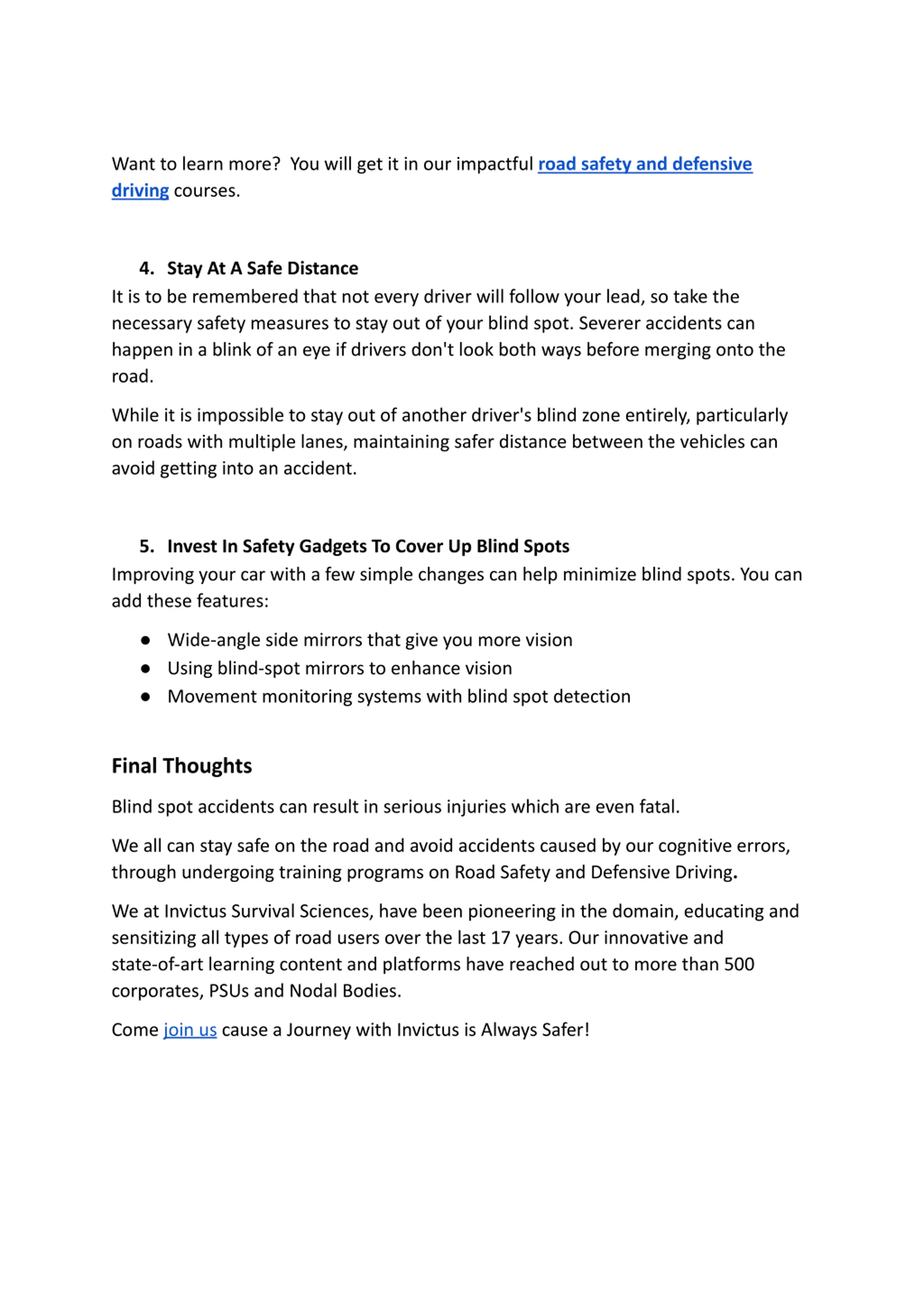 Want to learn more? You will get it in our impactful road safety anddefensive driving courses. 4.Stay At A Safe Distance It is to be remembered that not every driver will follow your lead, so take the necessary safety measures to stay out of your blind spot. Severer accidents can happen in a blink of an eye if drivers don't look both ways before merging onto the road. While it is impossible to stay out of another driver's blind zone entirely, particularly on roads with multiple lanes, maintaining safer distance between the vehicles can avoid getting into an accident. 5.Invest In Safety Gadgets To Cover Up Blind Spots Improving your car with a few simple changes can help minimize blind spots. You can add these features: Wide-angle side mirrors that give you more vision Using blind-spot mirrors to enhance vision Movement monitoring systems with blind spot detection Final Thoughts Blind spot accidents can result in serious injuries which are even fatal. We all can stay safe on the road and avoid accidents caused by our cognitive errors, through undergoing training programs on Road Safety and Defensive Driving. We at Invictus Survival Sciences, have been pioneering in the domain, educating and sensitizing all types of road users over the last 17 years. Our innovative and state-of-art learning content and platforms have reached out to more than 500 corporates, PSUs and Nodal Bodies. Come join us cause a Journey with Invictus is Always Safer!