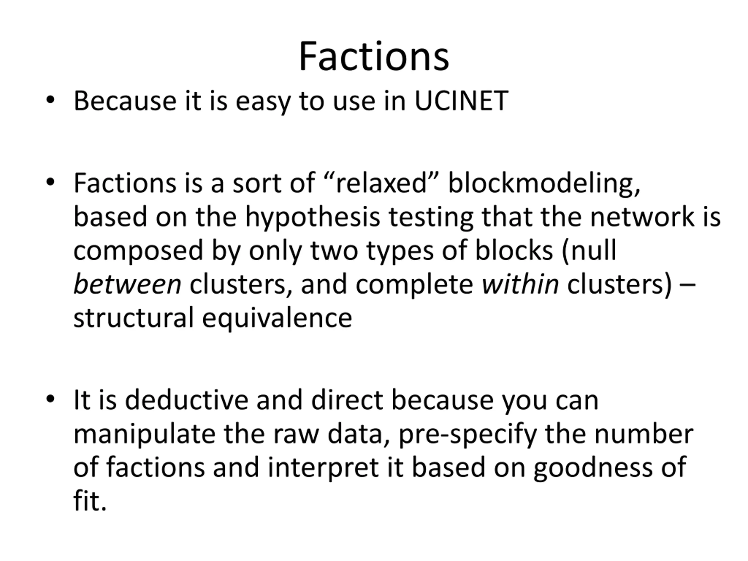 Factions Because it is easy to use in UCINET Factions is a sort of relaxed blockmodeling, based on the hypothesis testing that the network is composed by only two types of blocks (null between clusters, and complete within clusters) structural equivalence It is deductive and direct because you can manipulate the raw data, pre-specify the number of factions and interpret it based on goodness of fit.
