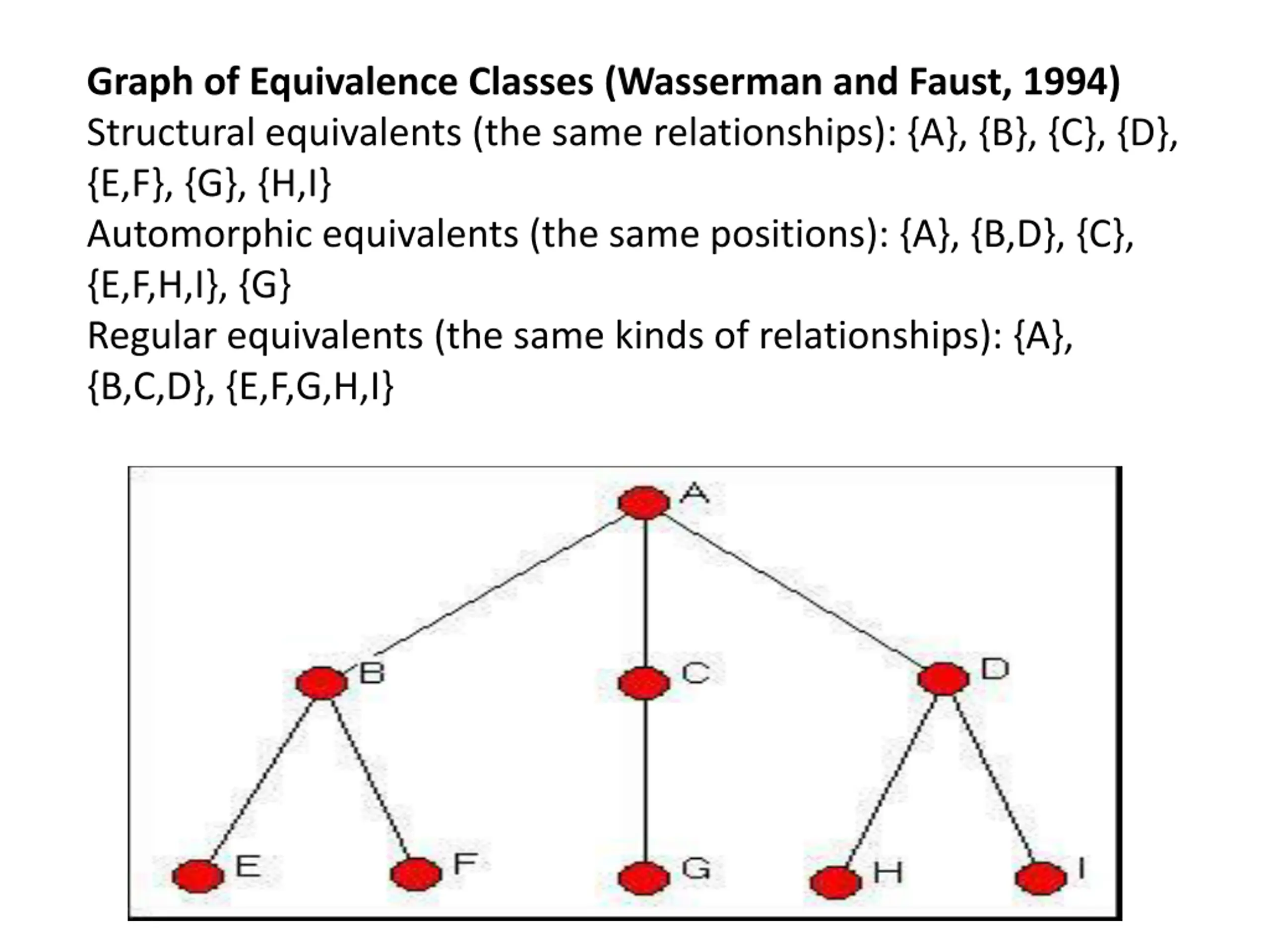 Graph of Equivalence Classes (Wasserman and Faust, 1994) Structural equivalents (the same relationships): {A}, {B}, {C}, {D}, {E,F}, {G}, {H,I} Automorphic equivalents (the same positions): {A}, {B,D}, {C}, {E,F,H,I}, {G} Regular equivalents (the same kinds of relationships): {A}, {B,C,D}, {E,F,G,H,I}