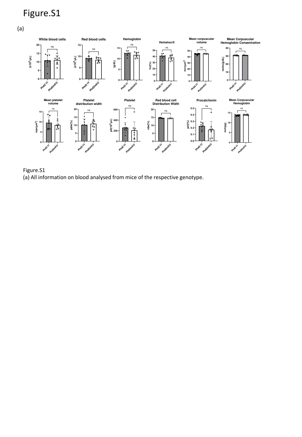 Figure.S1 (a) Mean corpuscular volume Hemoglobin Mean Corpuscular Hemoglobin Consentration White blood cells Red blood cells Hematocrit ns 20 15 ns ns ns 15 40 ns ns 50 50 15 30 10 40 40 (x103/ L) (x106/ L) mchc(g/dL) 10 mcv( m3) (g/dL) 10 30 30 hct(%) 20 5 20 20 5 5 10 10 10 0 0 0 0 0 0 Phd2 f/f Phd2mKO Phd2 f/f Phd2mKO Phd2 f/f Phd2 f/f Phd2mKO Phd2mKO Phd2 f/f Phd2mKO Phd2 f/f Phd2mKO Mean Corpuscular Hemoglobin Mean platelet volume Platelet Red blood cell Distribution Width Platelet Procalcitonin distribution width ns ns ns 0.5 ns 20 20 600 ns ns 15 15 0.4 15 15 400 plt(103/ L) 0.3 pdw(%) pct(%) 10 rdw(%) mpv( m3) 10 mch(pg) 10 10 0.2 200 5 5 5 5 0.1 0.0 0 0 0 0 0 Phd2 f/f Phd2mKO Phd2 f/f Phd2mKO Phd2 f/f Phd2mKO Phd2 f/f Phd2mKO Phd2 f/f Phd2mKO Phd2 f/f Phd2mKO Figure.S1 (a) All information on blood analysed from mice of the respective genotype.