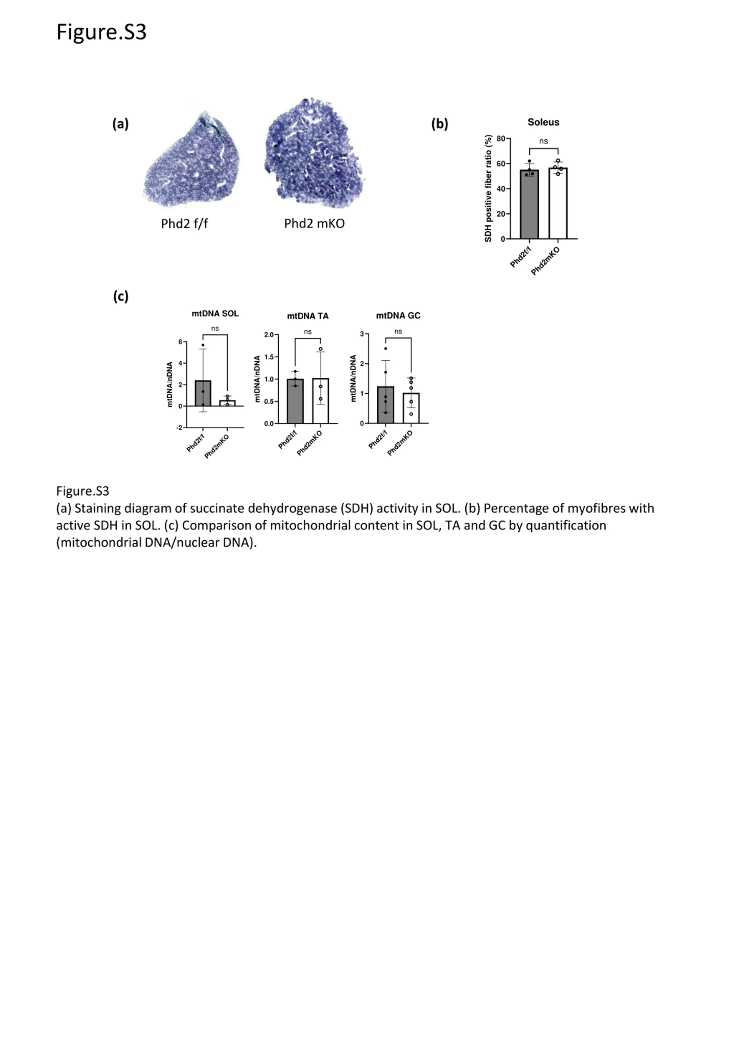 Figure.S3 Soleus (a) (b) 80 SDH positive fiber ratio (%) ns 60 40 20 Phd2 mKO Phd2 f/f 0 Phd2mKO Phd2f/f (c) mtDNA SOL mtDNA GC mtDNA TA ns ns ns 3 2.0 6 1.5 mtDNA/nDNA mtDNA/nDNA 4 2 mtDNA/nDNA 1.0 2 1 0.5 0 0 0.0 -2 Phd2mKO Phd2f/f Phd2mKO Phd2f/f Phd2mKO Phd2f/f Figure.S3 (a) Staining diagram of succinate dehydrogenase (SDH) activity in SOL. (b) Percentage of myofibres with active SDH in SOL. (c) Comparison of mitochondrial content in SOL, TA and GC by quantification (mitochondrial DNA/nuclear DNA).