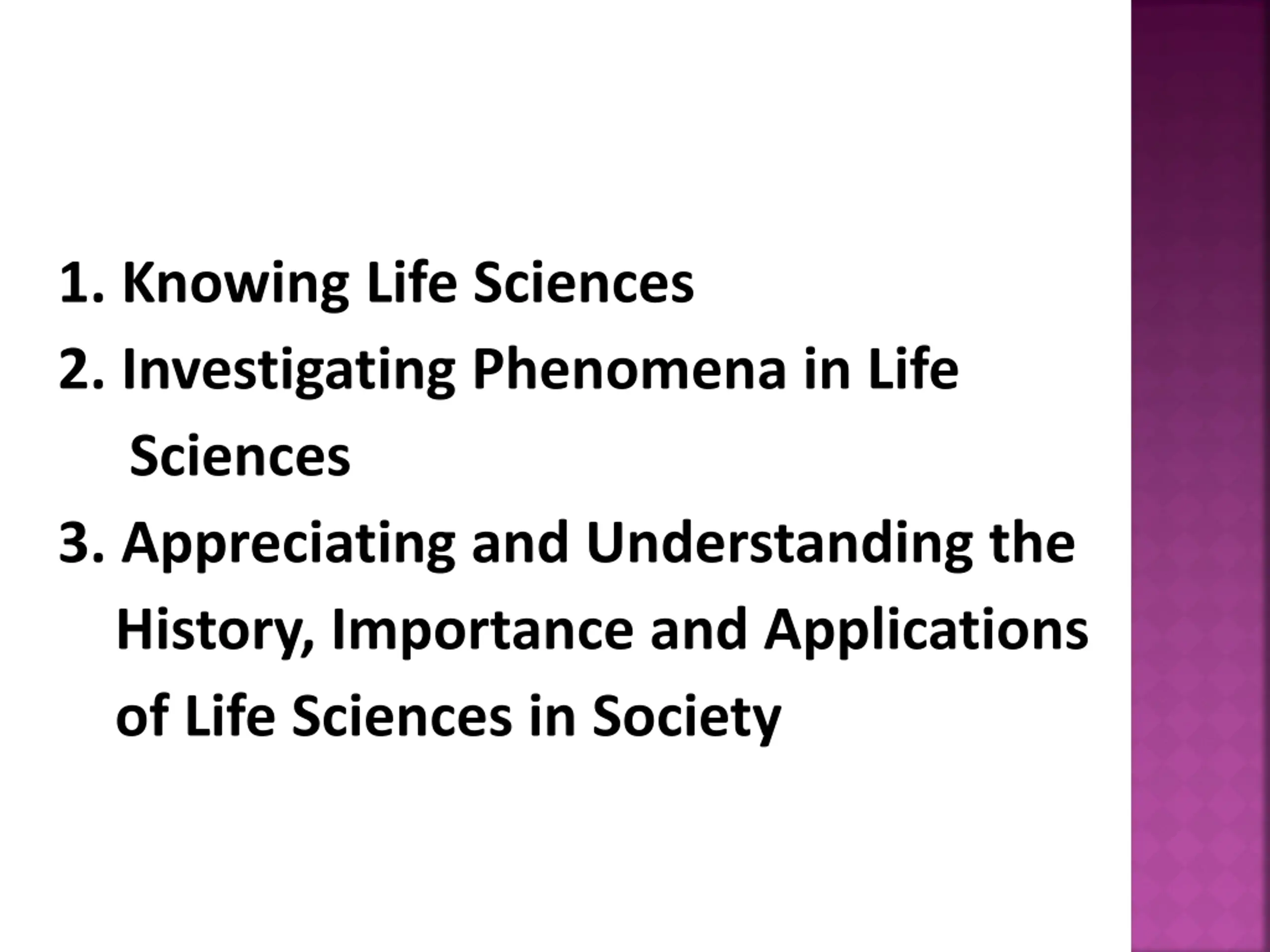 1. Knowing Life Sciences 2. Investigating Phenomena in Life Sciences 3. Appreciating and Understanding the History, Importance and Applications of Life Sciences in Society