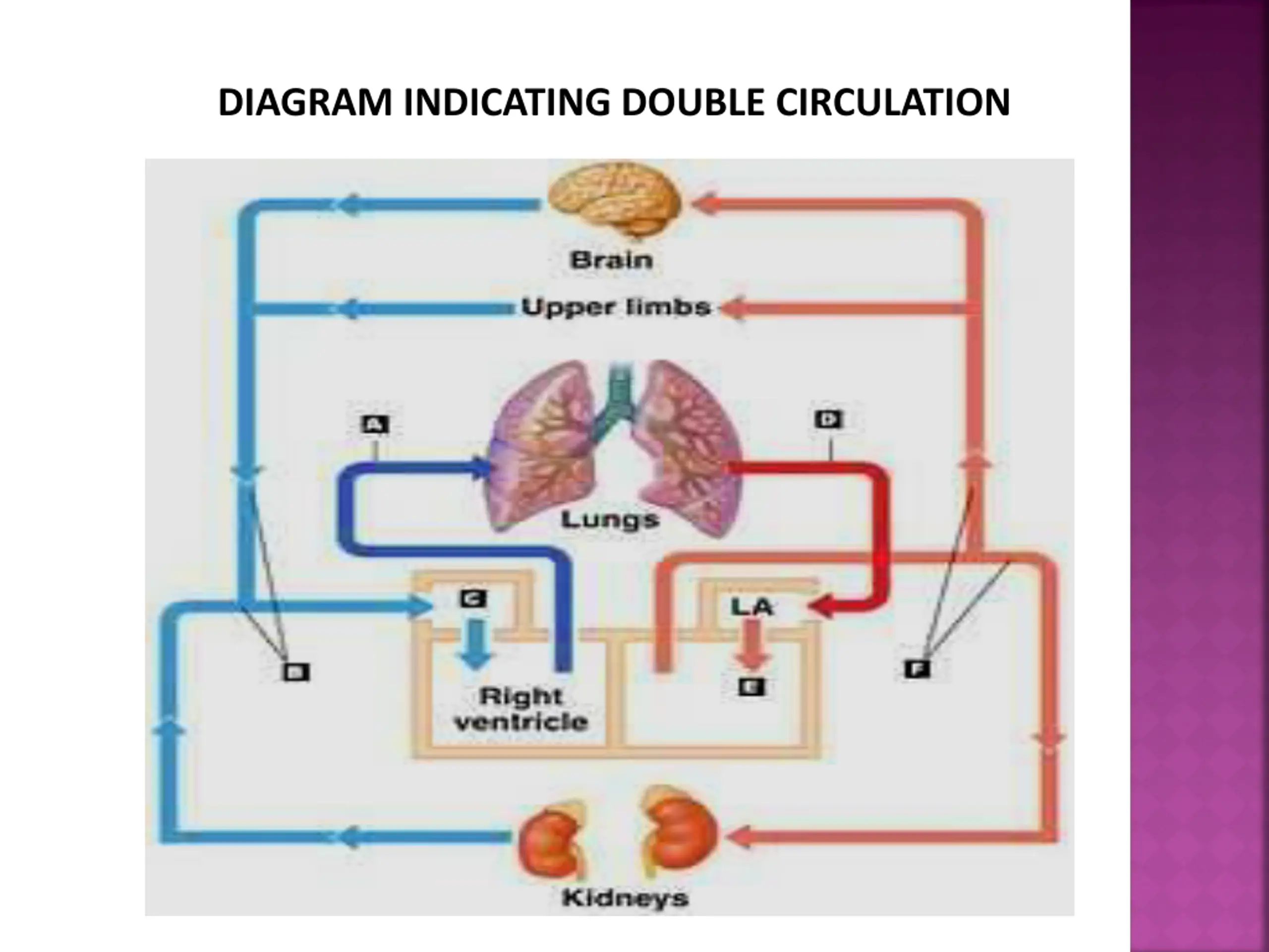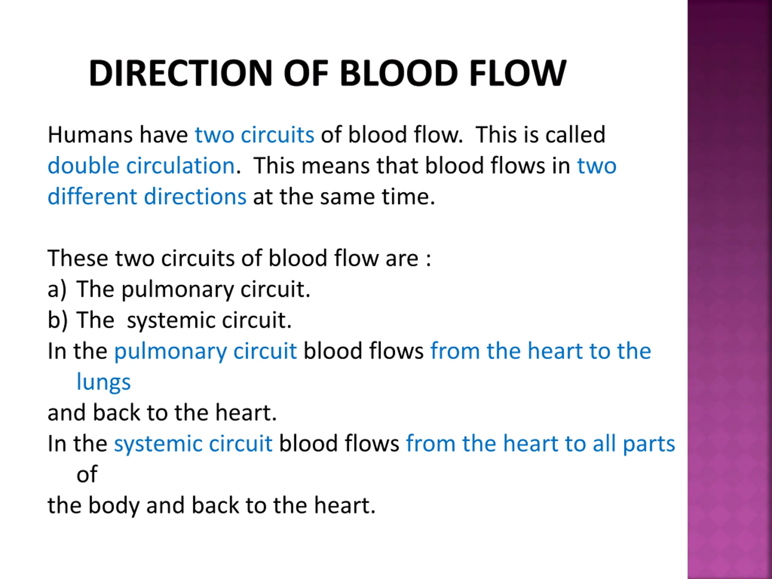 DIRECTION OF BLOOD FLOW Humans have two circuits of blood flow. This is called double circulation. This means that blood flows in two different directions at the same time. These two circuits of blood flow are : a) The pulmonary circuit. b) The systemic circuit. In the pulmonary circuit blood flows from the heart to the lungs and back to the heart. In the systemic circuit blood flows from the heart to all parts of the body and back to the heart.