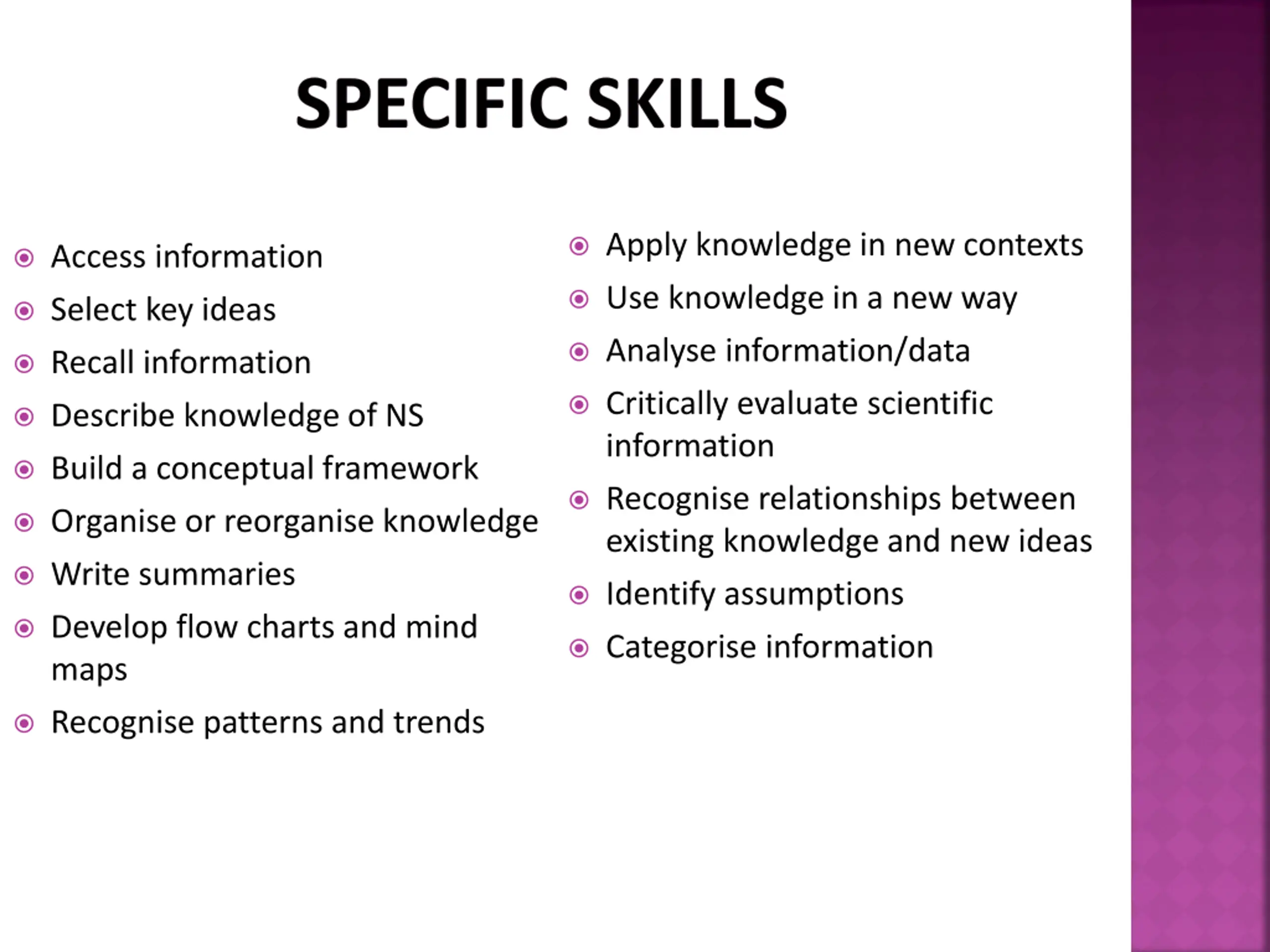 SPECIFIC SKILLS Apply knowledge in new contexts Access information Use knowledge in a new way Select key ideas Analyse information/data Recall information Critically evaluate scientific information Describe knowledge of NS Build a conceptual framework Recognise relationships between existing knowledge and new ideas Organise or reorganise knowledge Write summaries Identify assumptions Develop flow charts and mind maps Categorise information Recognise patterns and trends