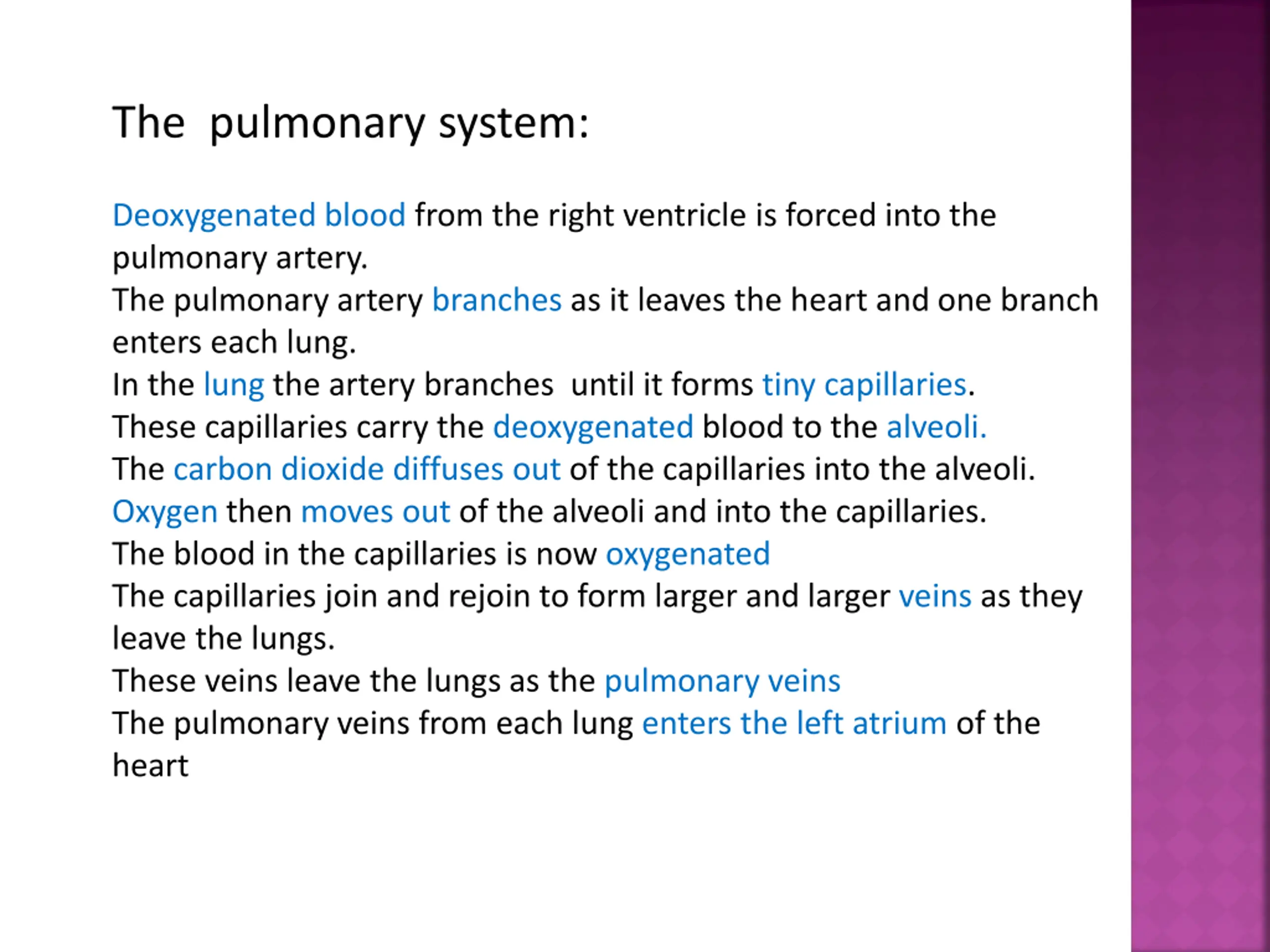 The pulmonary system: Deoxygenated blood from the right ventricle is forced into the pulmonary artery. The pulmonary artery branches as it leaves the heart and one branch enters each lung. In the lung the artery branches until it forms tiny capillaries. These capillaries carry the deoxygenated blood to the alveoli. The carbon dioxide diffuses out of the capillaries into the alveoli. Oxygen then moves out of the alveoli and into the capillaries. The blood in the capillaries is now oxygenated The capillaries join and rejoin to form larger and larger veins as they leave the lungs. These veins leave the lungs as the pulmonary veins The pulmonary veins from each lung enters the left atrium of the heart
