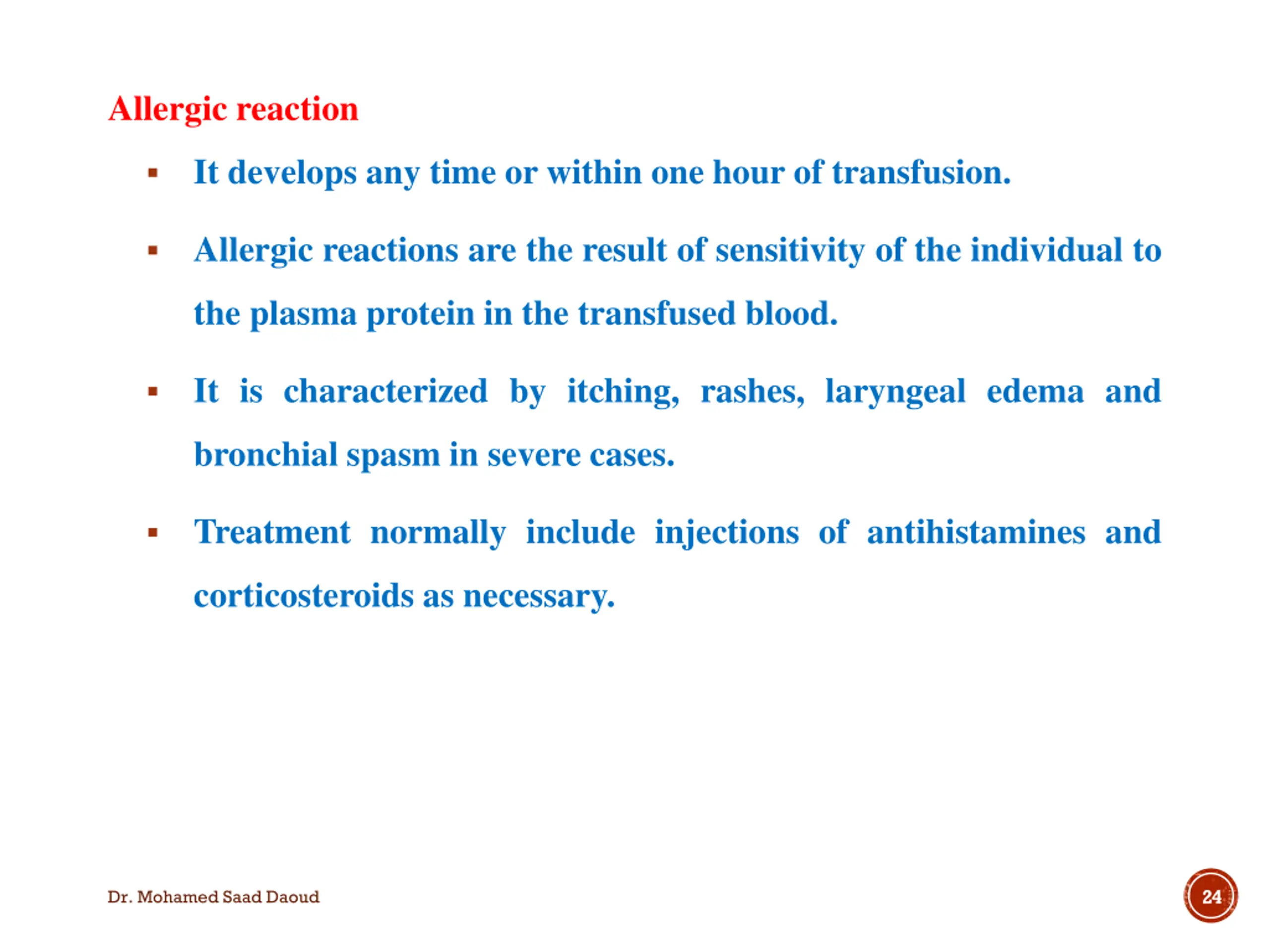 Allergic reaction It develops any time or within one hour of transfusion. Allergic reactions are the result of sensitivity of the individual to the plasma protein in the transfused blood. It is characterized by itching, rashes, laryngeal edema and bronchial spasm in severe cases. Treatment normally include injections of antihistamines and corticosteroids as necessary. 24 Dr. Mohamed Saad Daoud