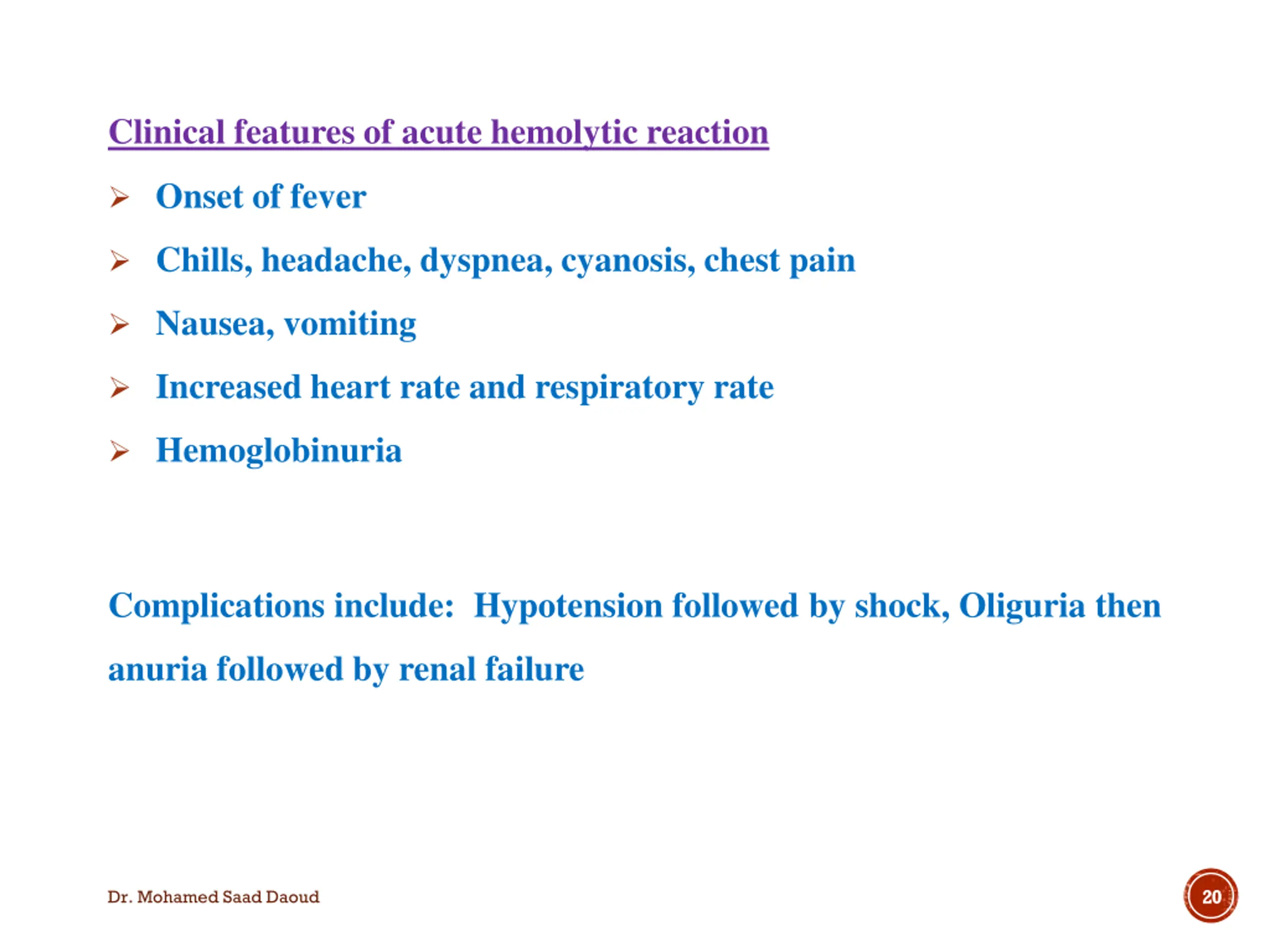 Clinical features of acute hemolytic reaction Onset of fever Chills, headache, dyspnea, cyanosis, chest pain Nausea, vomiting Increased heart rate and respiratory rate Hemoglobinuria Complications include: Hypotension followed by shock, Oliguria then anuria followed by renal failure 20 Dr. Mohamed Saad Daoud