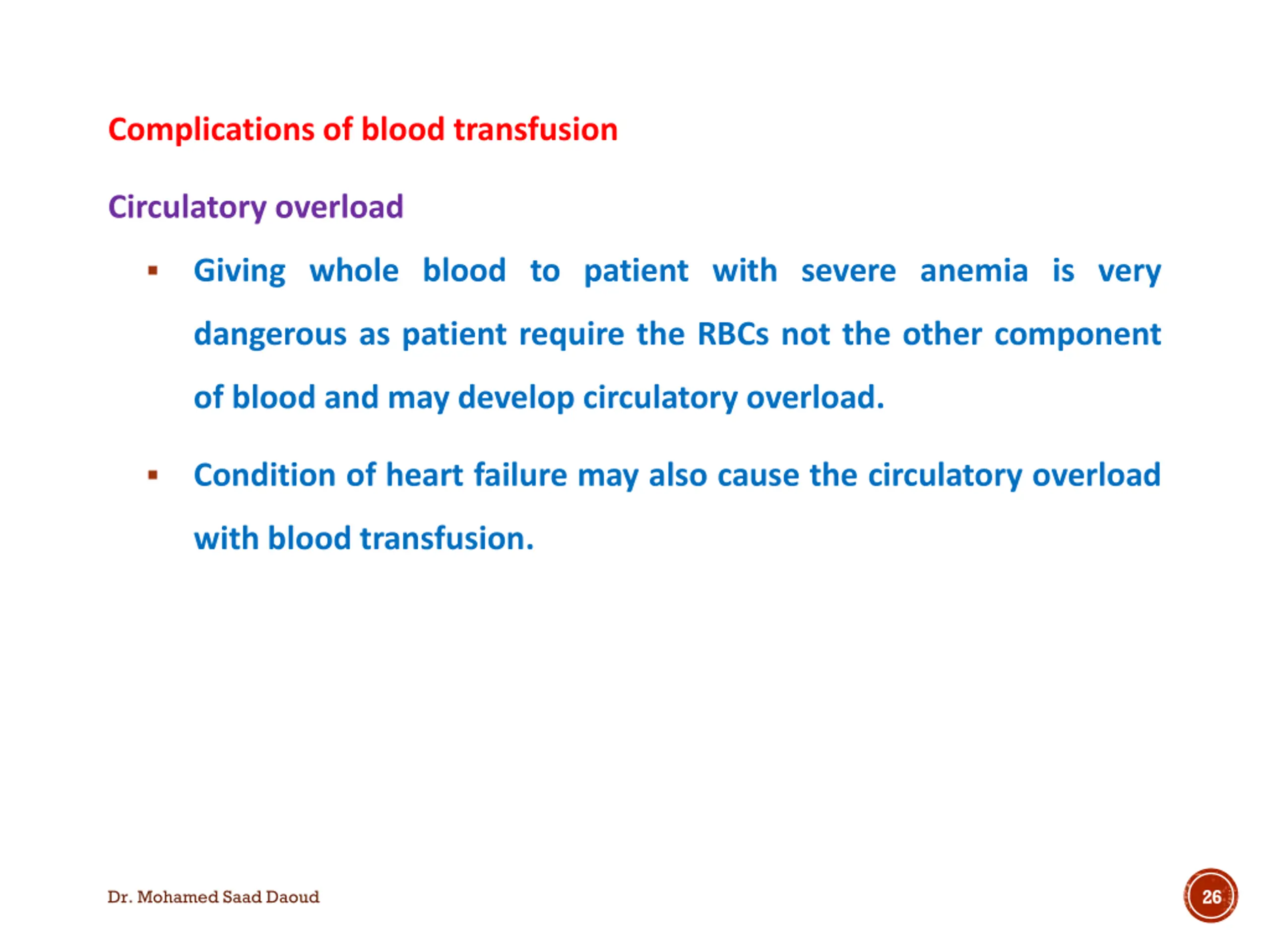 Complications of blood transfusion Circulatory overload Giving whole blood to patient with severe anemia is very dangerous as patient require the RBCs not the other component of blood and may develop circulatory overload. Condition of heart failure may also cause the circulatory overload with blood transfusion. 26 Dr. Mohamed Saad Daoud