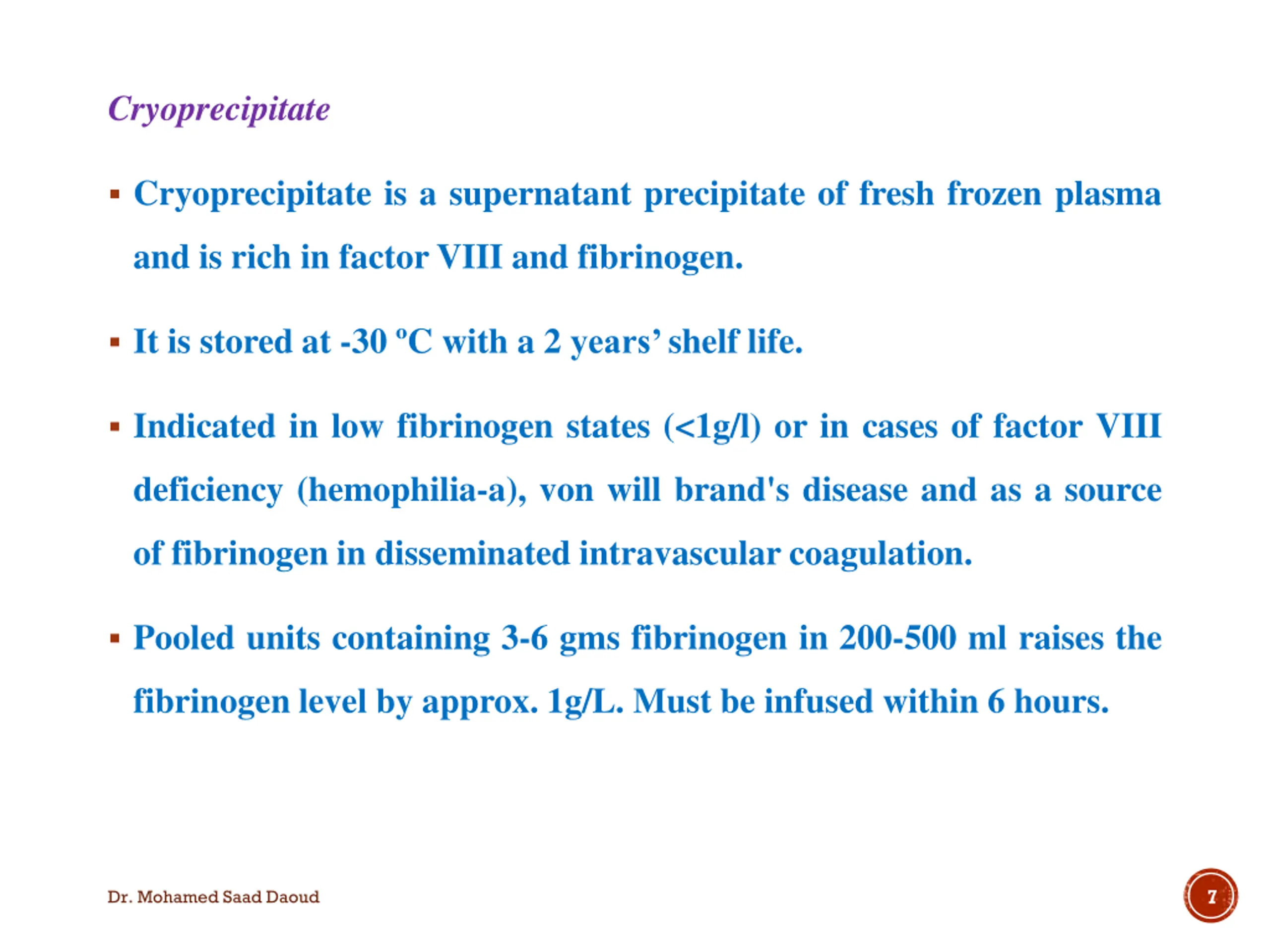 Cryoprecipitate Cryoprecipitate is a supernatant precipitate of fresh frozen plasma and is rich in factor VIII and fibrinogen. It is stored at -30 C with a 2 years shelf life. Indicated in low fibrinogen states (<1g/l) or in cases of factor VIII deficiency (hemophilia-a), von will brand's disease and as a source of fibrinogen in disseminated intravascular coagulation. Pooled units containing 3-6 gms fibrinogen in 200-500 ml raises the fibrinogen level by approx. 1g/L. Must be infused within 6 hours. 7 Dr. Mohamed Saad Daoud