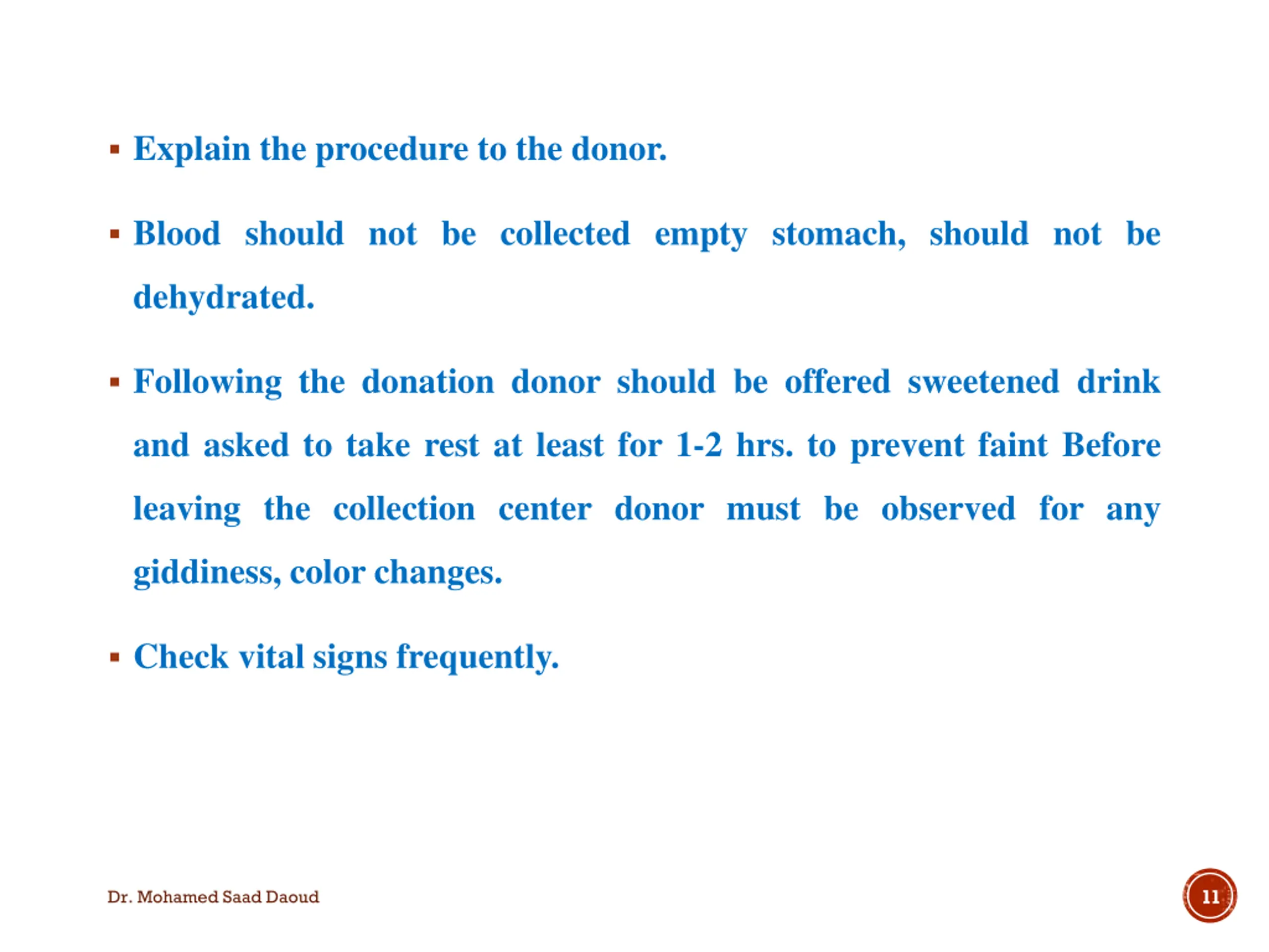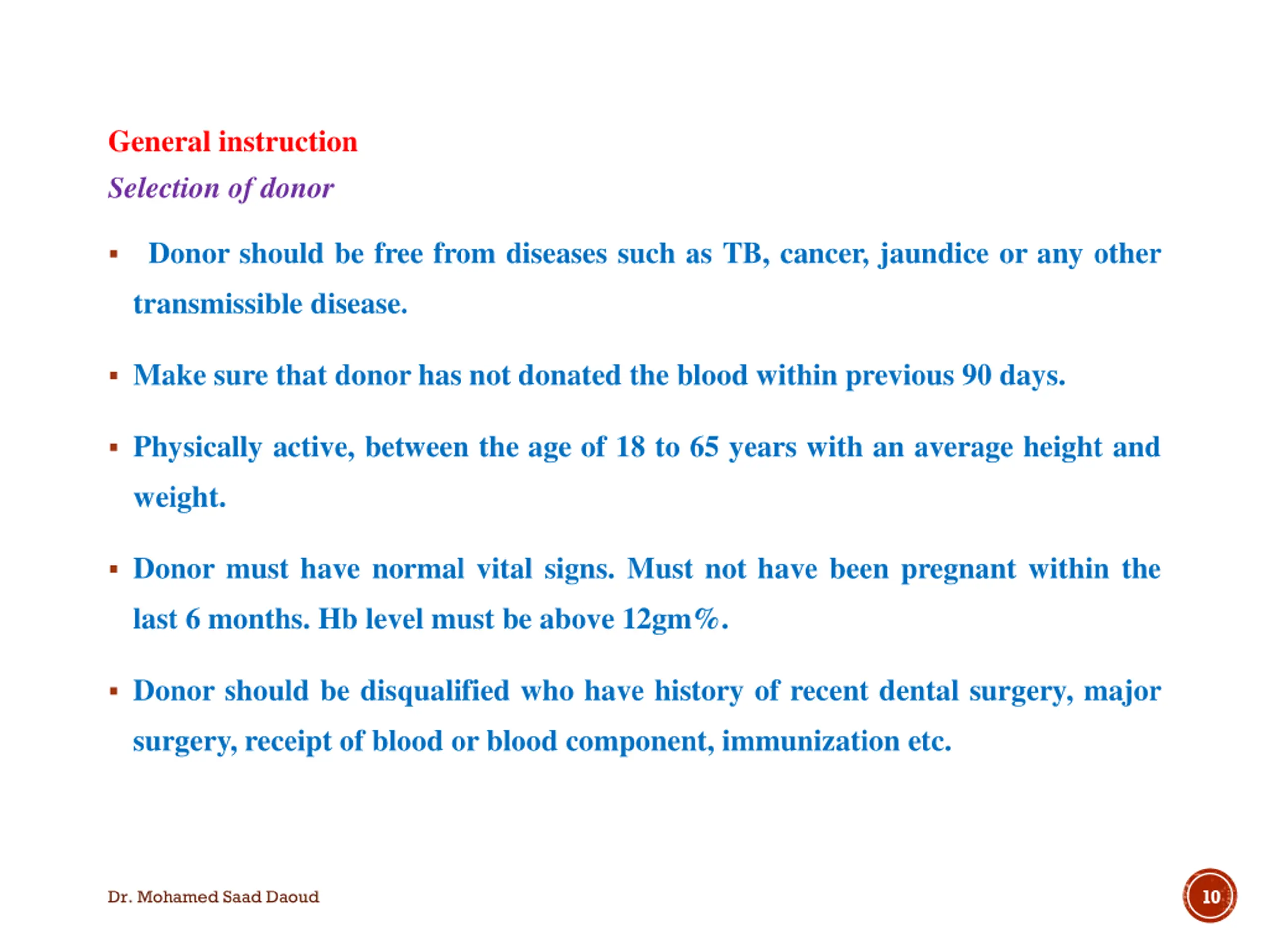 General instruction Selection of donor Donor should be free from diseases such as TB, cancer, jaundice or any other transmissible disease. Make sure that donor has not donated the blood within previous 90 days. Physically active, between the age of 18 to 65 years with an average height and weight. Donor must have normal vital signs. Must not have been pregnant within the last 6 months. Hb level must be above 12gm%. Donor should be disqualified who have history of recent dental surgery, major surgery, receipt of blood or blood component, immunization etc. 10 Dr. Mohamed Saad Daoud