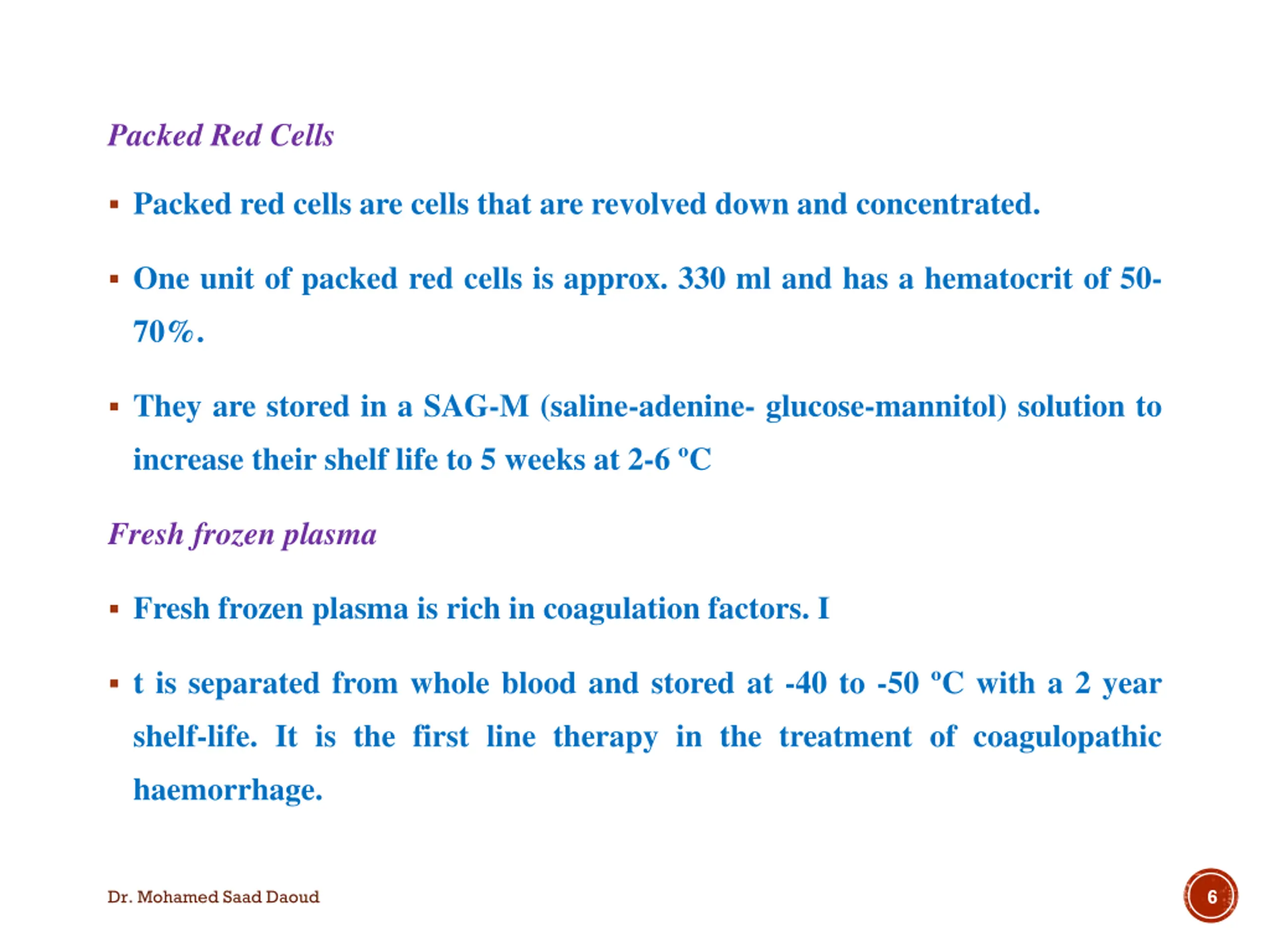 Packed Red Cells Packed red cells are cells that are revolved down and concentrated. One unit of packed red cells is approx. 330 ml and has a hematocrit of 50- 70%. They are stored in a SAG-M (saline-adenine- glucose-mannitol) solution to increase their shelf life to 5 weeks at 2-6 C Fresh frozen plasma Fresh frozen plasma is rich in coagulation factors. I t is separated from whole blood and stored at -40 to -50 C with a 2 year shelf-life. It is the first line therapy in the treatment of coagulopathic haemorrhage. 6 Dr. Mohamed Saad Daoud