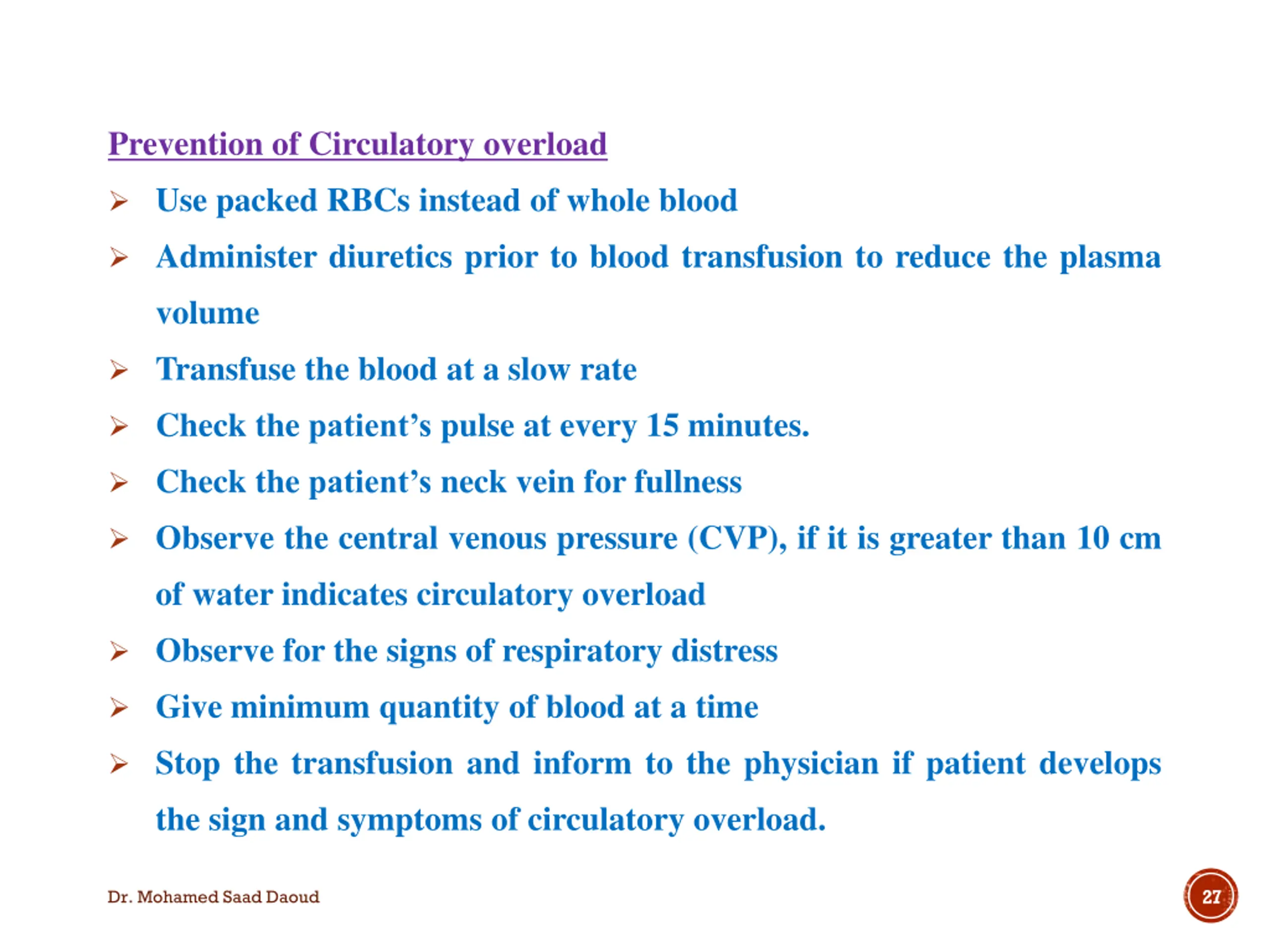Prevention of Circulatory overload Use packed RBCs instead of whole blood Administer diuretics prior to blood transfusion to reduce the plasma volume Transfuse the blood at a slow rate Check the patient s pulse at every 15 minutes. Check the patient s neck vein for fullness Observe the central venous pressure (CVP), if it is greater than 10 cm of water indicates circulatory overload Observe for the signs of respiratory distress Give minimum quantity of blood at a time Stop the transfusion and inform to the physician if patient develops the sign and symptoms of circulatory overload. 27 Dr. Mohamed Saad Daoud