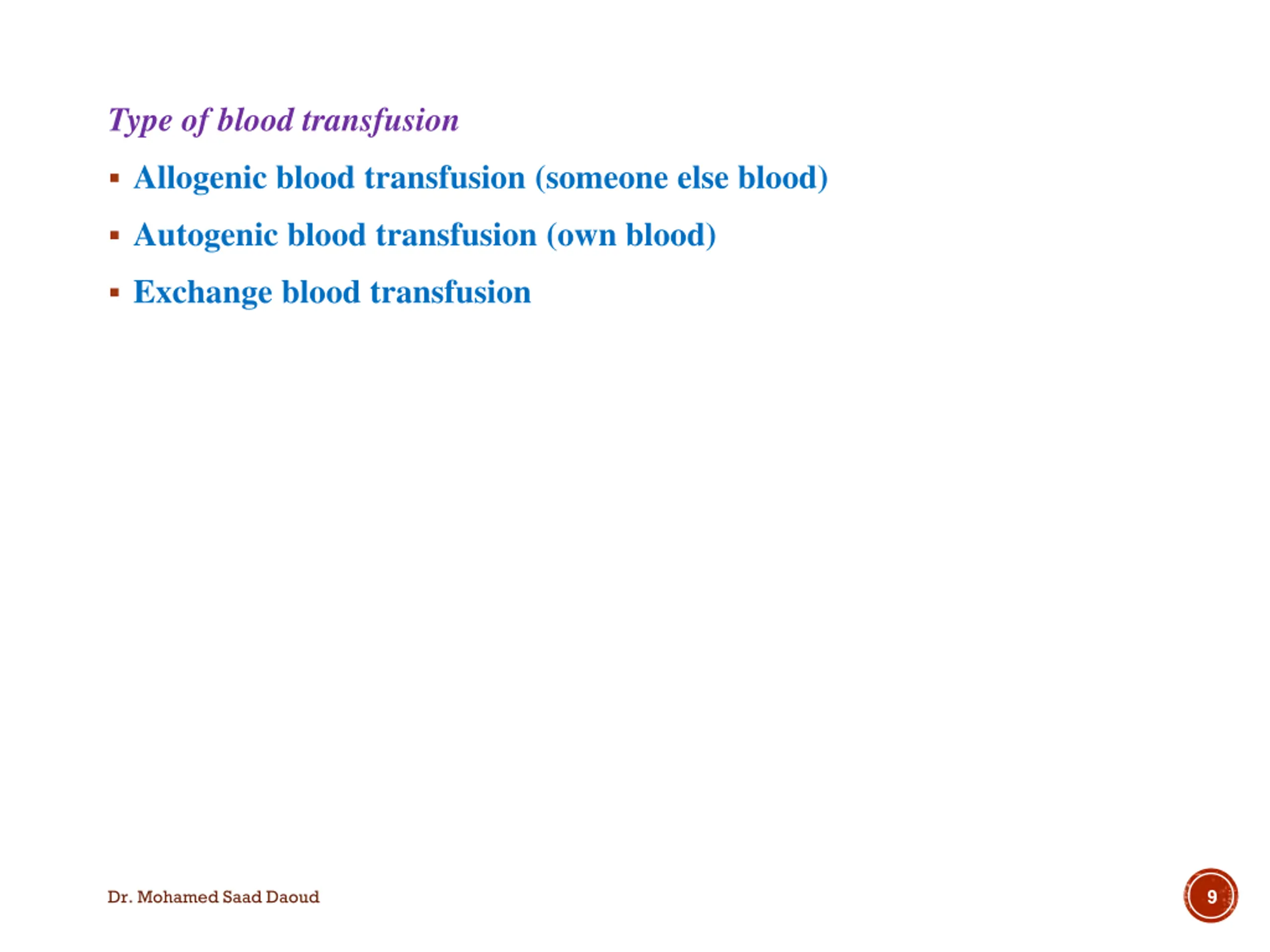 Type of blood transfusion Allogenic blood transfusion (someone else blood) Autogenic blood transfusion (own blood) Exchange blood transfusion 9 Dr. Mohamed Saad Daoud