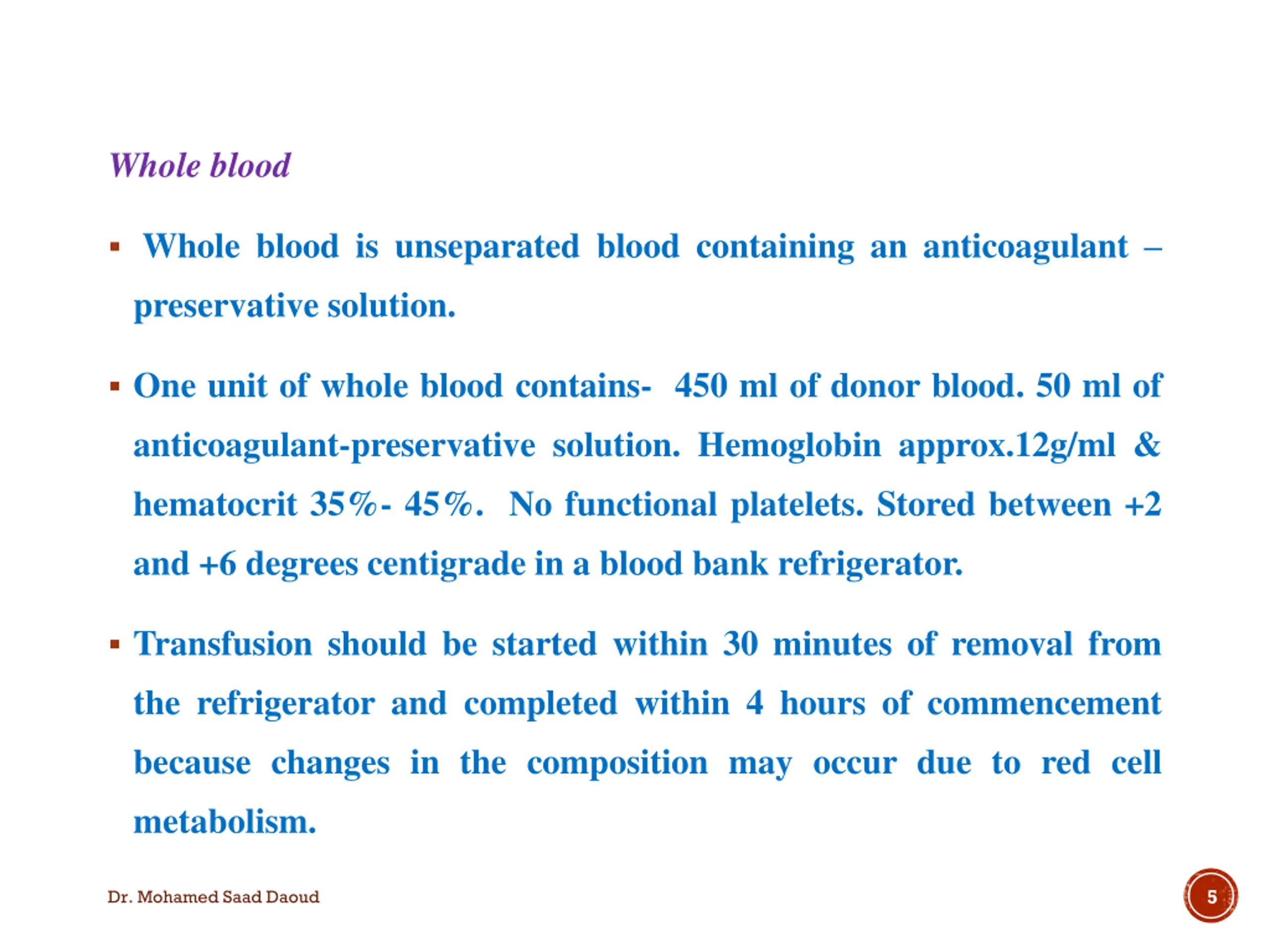 Whole blood Whole blood is unseparated blood containing an anticoagulant preservative solution. One unit of whole blood contains- 450 ml of donor blood. 50 ml of anticoagulant-preservative solution. Hemoglobin approx.12g/ml & hematocrit 35%- 45%. No functional platelets. Stored between +2 and +6 degrees centigrade in a blood bank refrigerator. Transfusion should be started within 30 minutes of removal from the refrigerator and completed within 4 hours of commencement because changes in the composition may occur due to red cell metabolism. 5 Dr. Mohamed Saad Daoud