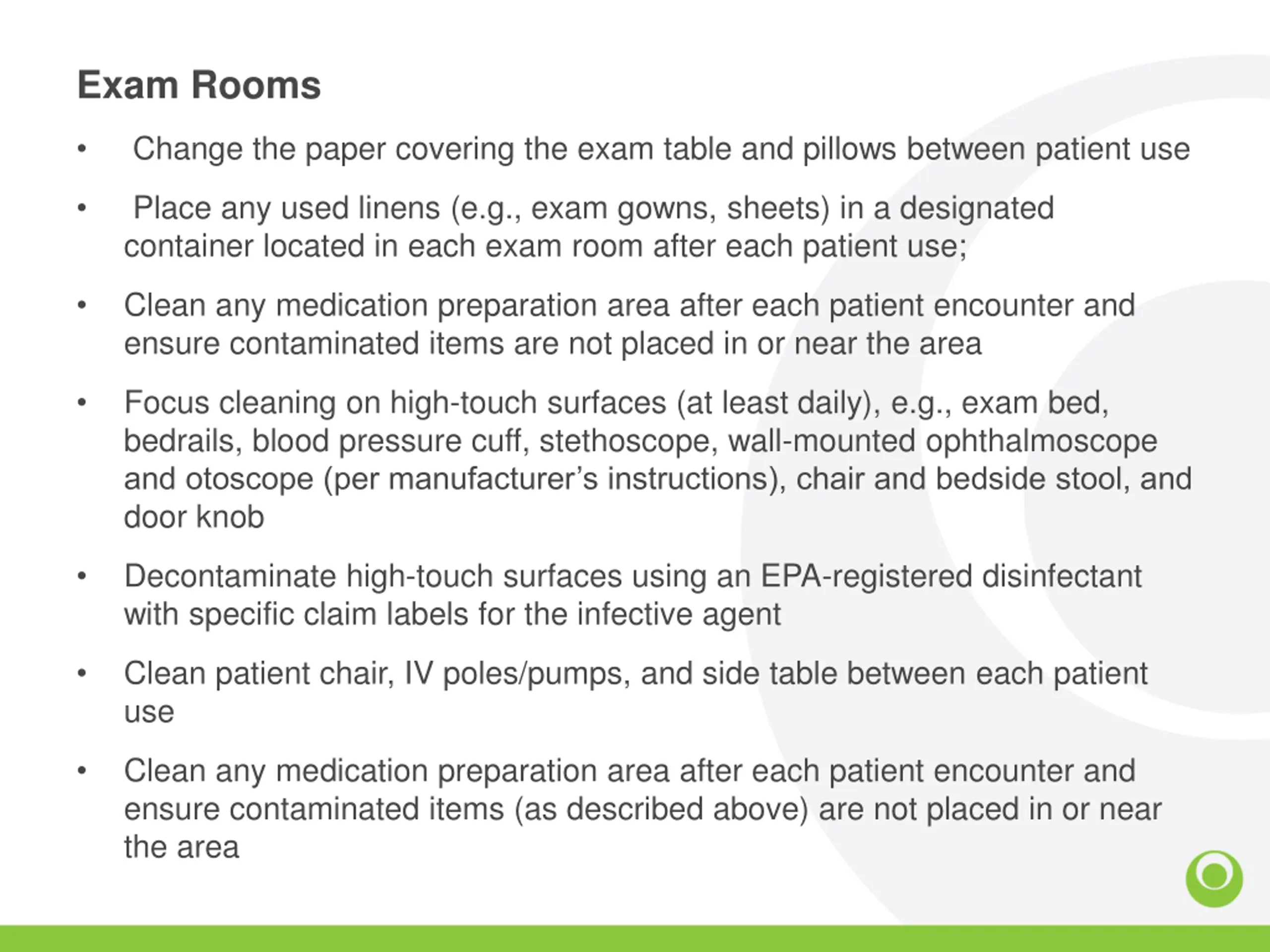 Exam Rooms Change the paper covering the exam table and pillows between patient use Place any used linens (e.g., exam gowns, sheets) in a designated container located in each exam room after each patient use; Clean any medication preparation area after each patient encounter and ensure contaminated items are not placed in or near the area Focus cleaning on high-touch surfaces (at least daily), e.g., exam bed, bedrails, blood pressure cuff, stethoscope, wall-mounted ophthalmoscope and otoscope (per manufacturer s instructions), chair and bedside stool, and door knob Decontaminate high-touch surfaces using an EPA-registered disinfectant with specific claim labels for the infective agent Clean patient chair, IV poles/pumps, and side table between each patient use Clean any medication preparation area after each patient encounter and ensure contaminated items (as described above) are not placed in or near the area