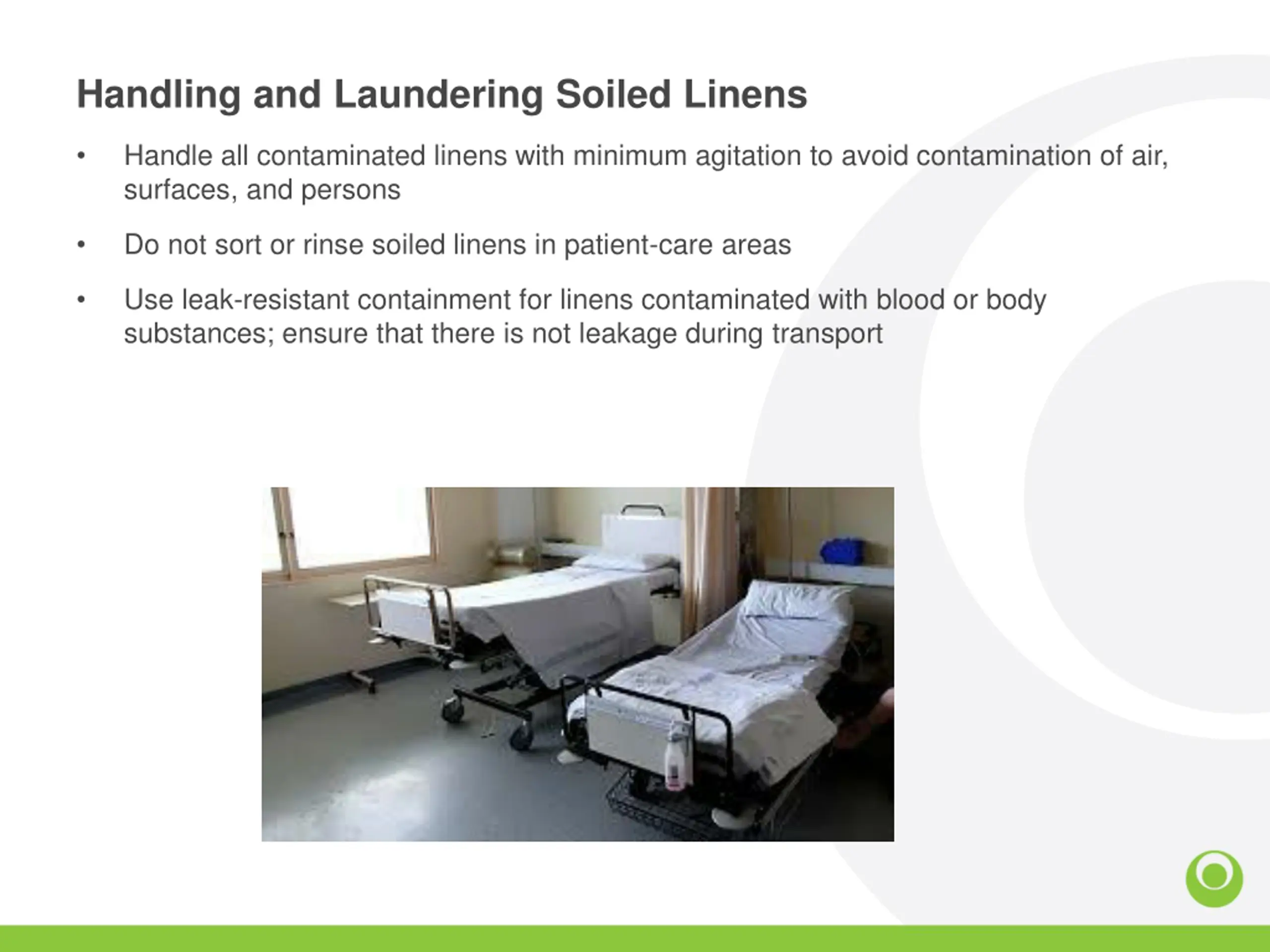 Handling and Laundering Soiled Linens Handle all contaminated linens with minimum agitation to avoid contamination of air, surfaces, and persons Do not sort or rinse soiled linens in patient-care areas Use leak-resistant containment for linens contaminated with blood or body substances; ensure that there is not leakage during transport