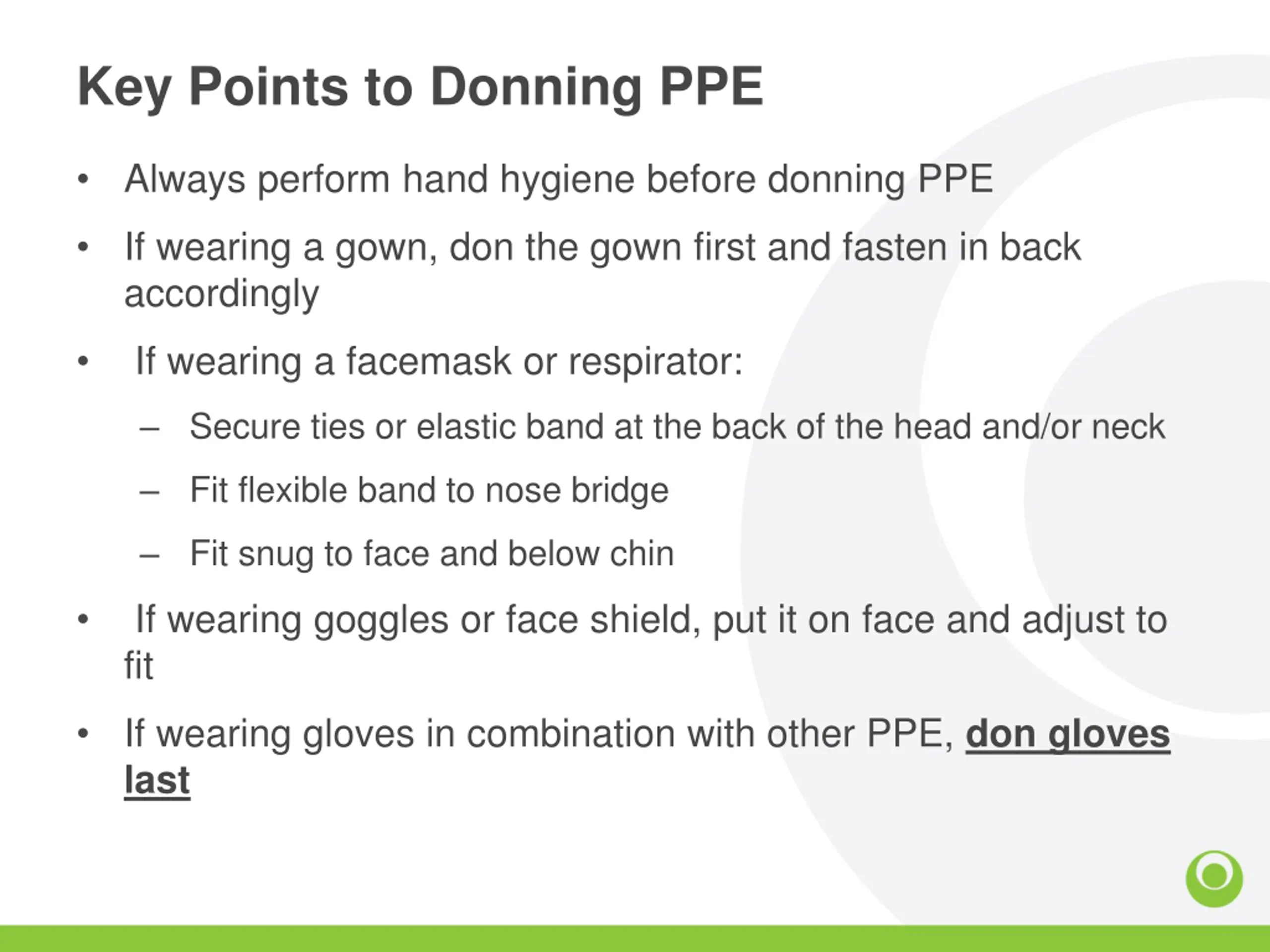 Key Points to Donning PPE Always perform hand hygiene before donning PPE If wearing a gown, don the gown first and fasten in back accordingly If wearing a facemask or respirator: Secure ties or elastic band at the back of the head and/or neck Fit flexible band to nose bridge Fit snug to face and below chin If wearing goggles or face shield, put it on face and adjust to fit If wearing gloves in combination with other PPE, don gloves last