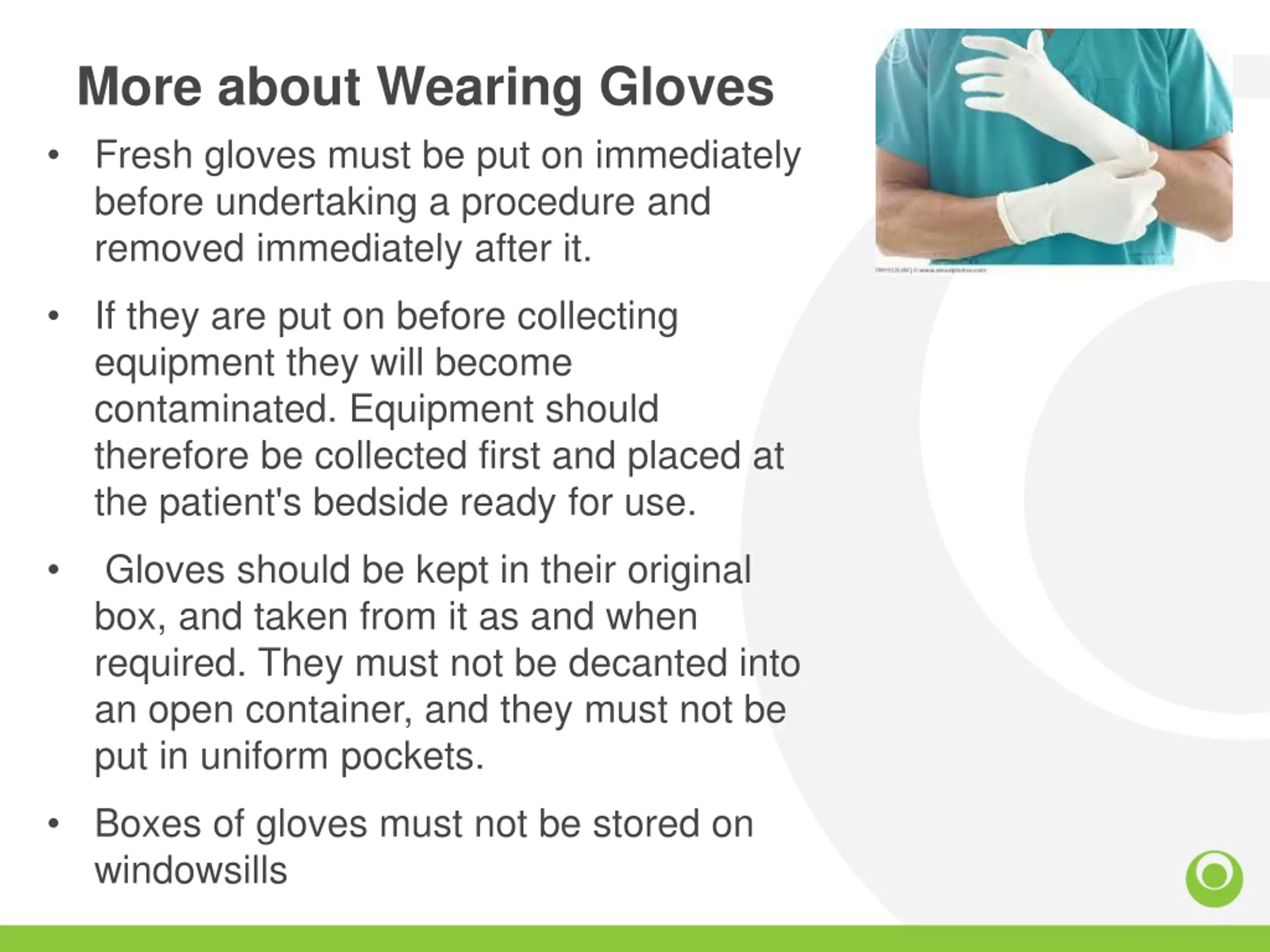 More about Wearing Gloves Fresh gloves must be put on immediately before undertaking a procedure and removed immediately after it. If they are put on before collecting equipment they will become contaminated. Equipment should therefore be collected first and placed at the patient's bedside ready for use. Gloves should be kept in their original box, and taken from it as and when required. They must not be decanted into an open container, and they must not be put in uniform pockets. Boxes of gloves must not be stored on windowsills
