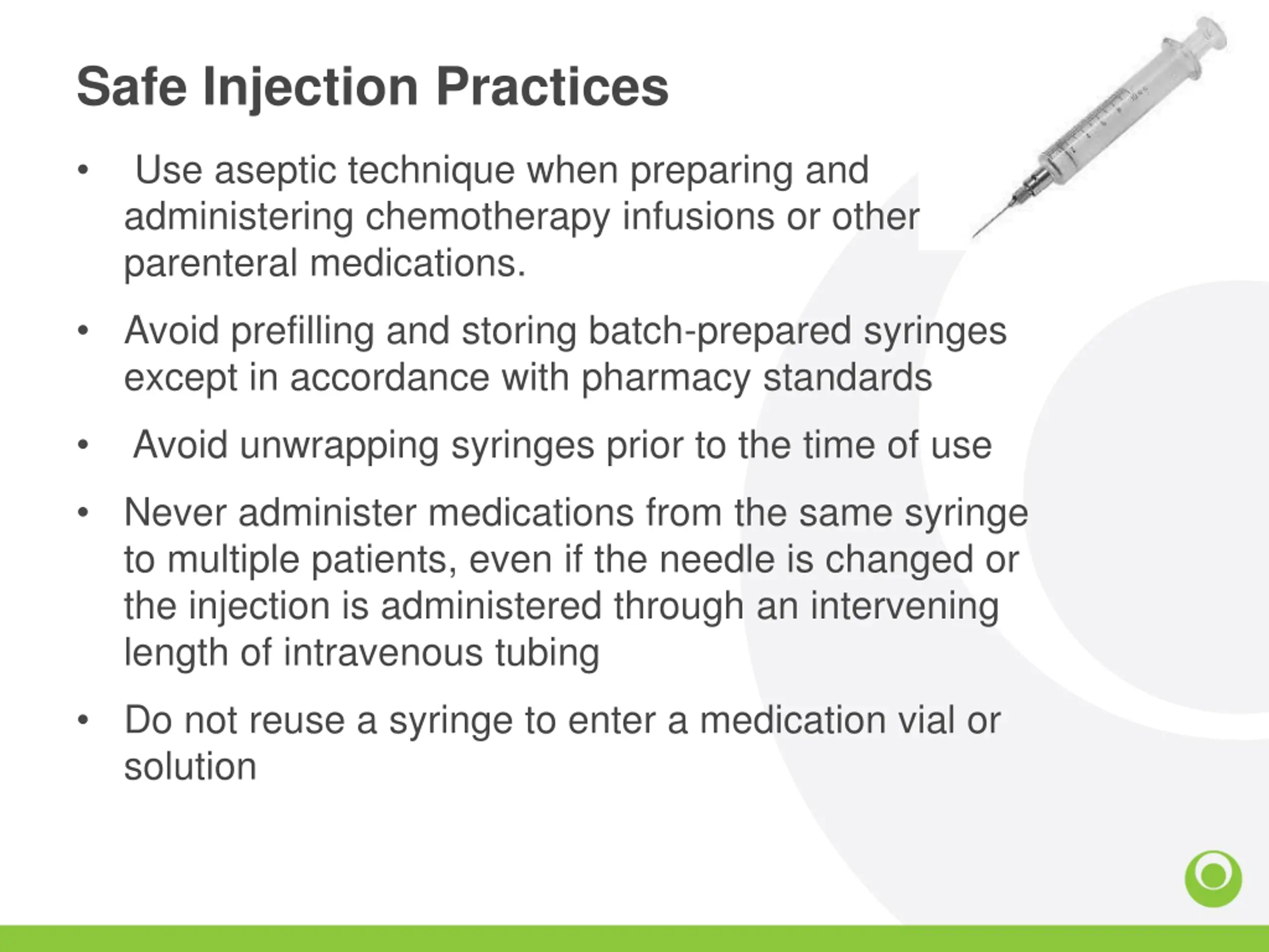 Safe Injection Practices Use aseptic technique when preparing and administering chemotherapy infusions or other parenteral medications. Avoid prefilling and storing batch-prepared syringes except in accordance with pharmacy standards Avoid unwrapping syringes prior to the time of use Never administer medications from the same syringe to multiple patients, even if the needle is changed or the injection is administered through an intervening length of intravenous tubing Do not reuse a syringe to enter a medication vial or solution
