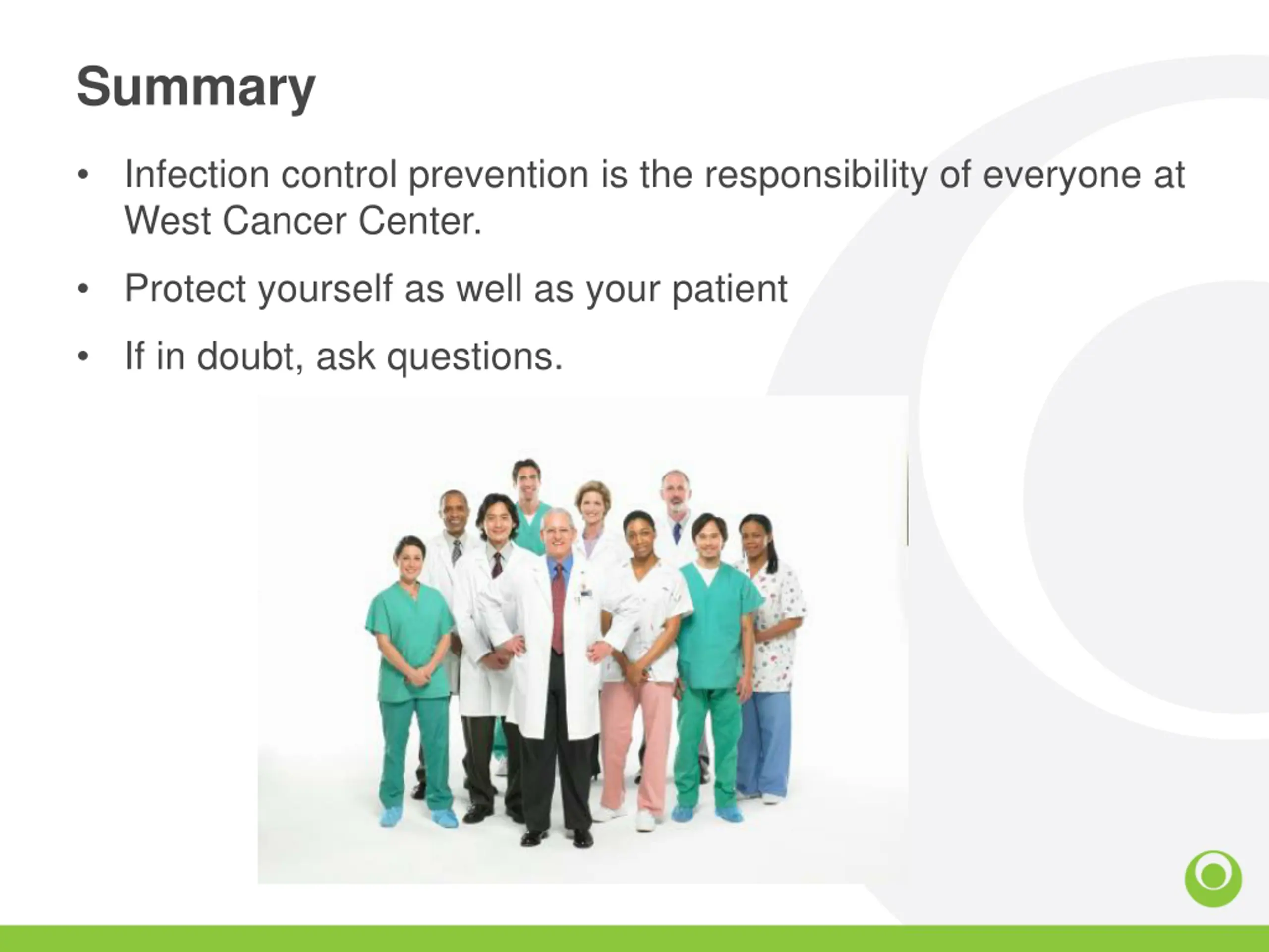 Summary Infection control prevention is the responsibility of everyone at West Cancer Center. Protect yourself as well as your patient If in doubt, ask questions.