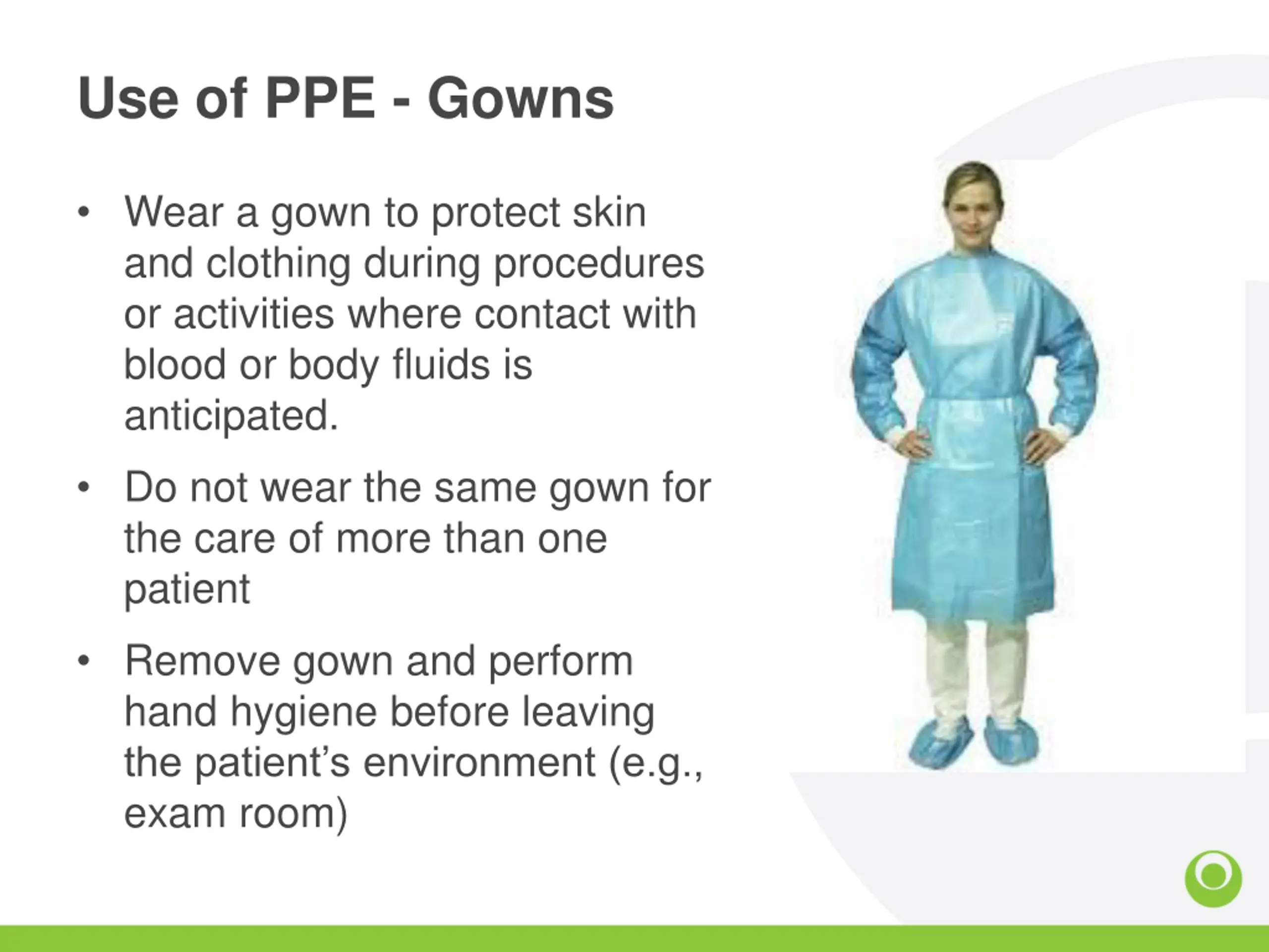 Use of PPE - Gowns Wear a gown to protect skin and clothing during procedures or activities where contact with blood or body fluids is anticipated. Do not wear the same gown for the care of more than one patient Remove gown and perform hand hygiene before leaving the patient s environment (e.g., exam room)