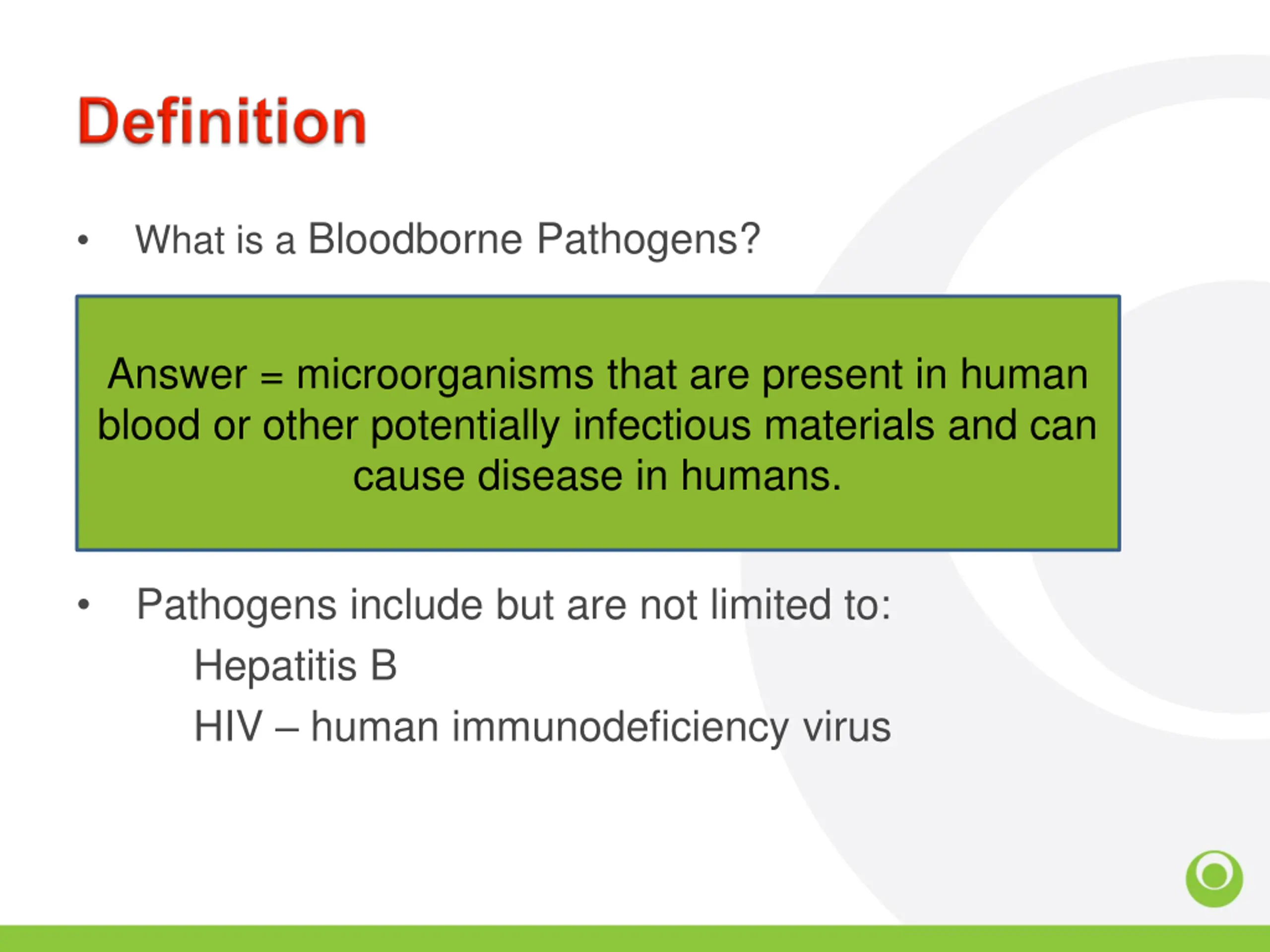 What is a Bloodborne Pathogens? Answer = microorganisms that are present in human blood or other potentially infectious materials and can cause disease in humans. Pathogens include but are not limited to: Hepatitis B HIV human immunodeficiency virus