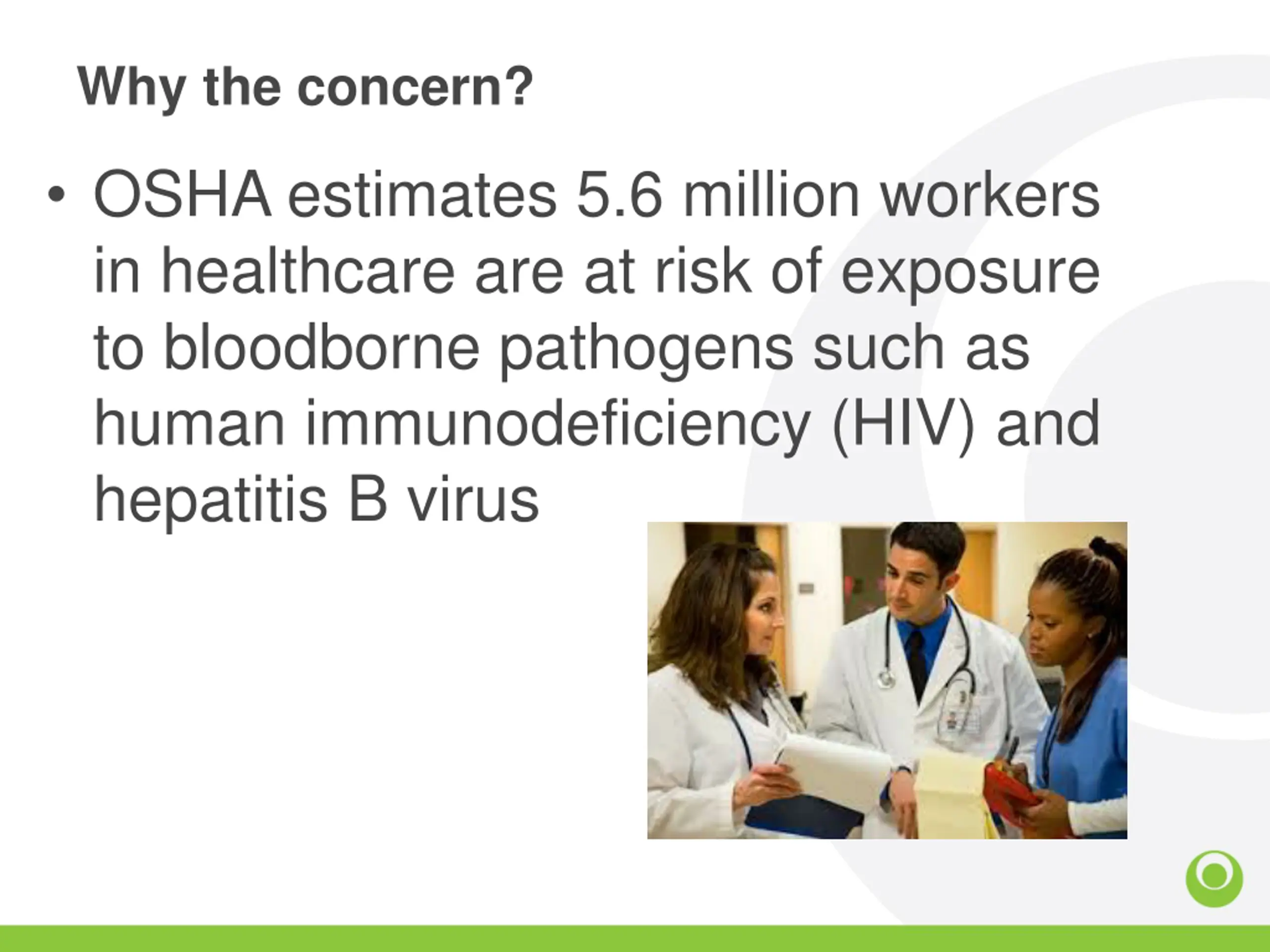 Why the concern? OSHA estimates 5.6 million workers in healthcare are at risk of exposure to bloodborne pathogens such as human immunodeficiency (HIV) and hepatitis B virus