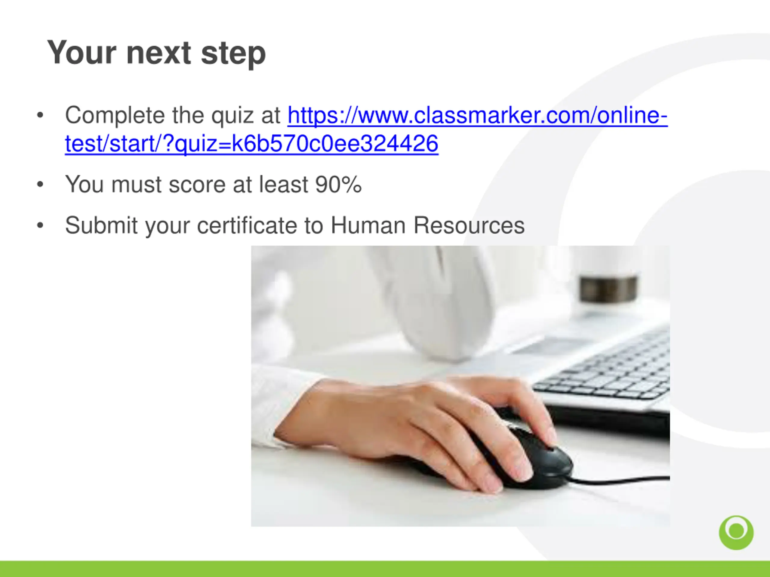 Your next step Complete the quiz at https://www.classmarker.com/online- test/start/?quiz=k6b570c0ee324426 You must score at least 90% Submit your certificate to Human Resources