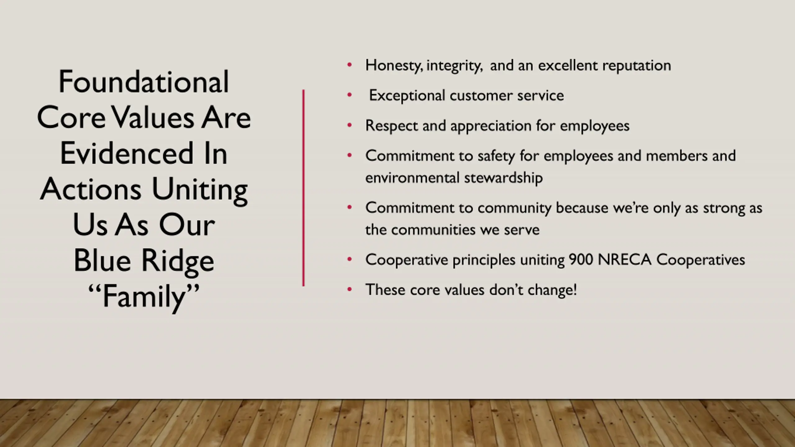 Honesty, integrity, and an excellent reputation Foundational Core Values Are Evidenced In Actions Uniting Us As Our Blue Ridge Family Exceptional customer service Respect and appreciation for employees Commitment to safety for employees and members and environmental stewardship Commitment to community because we re only as strong as the communities we serve Cooperative principles uniting 900 NRECA Cooperatives These core values don t change!